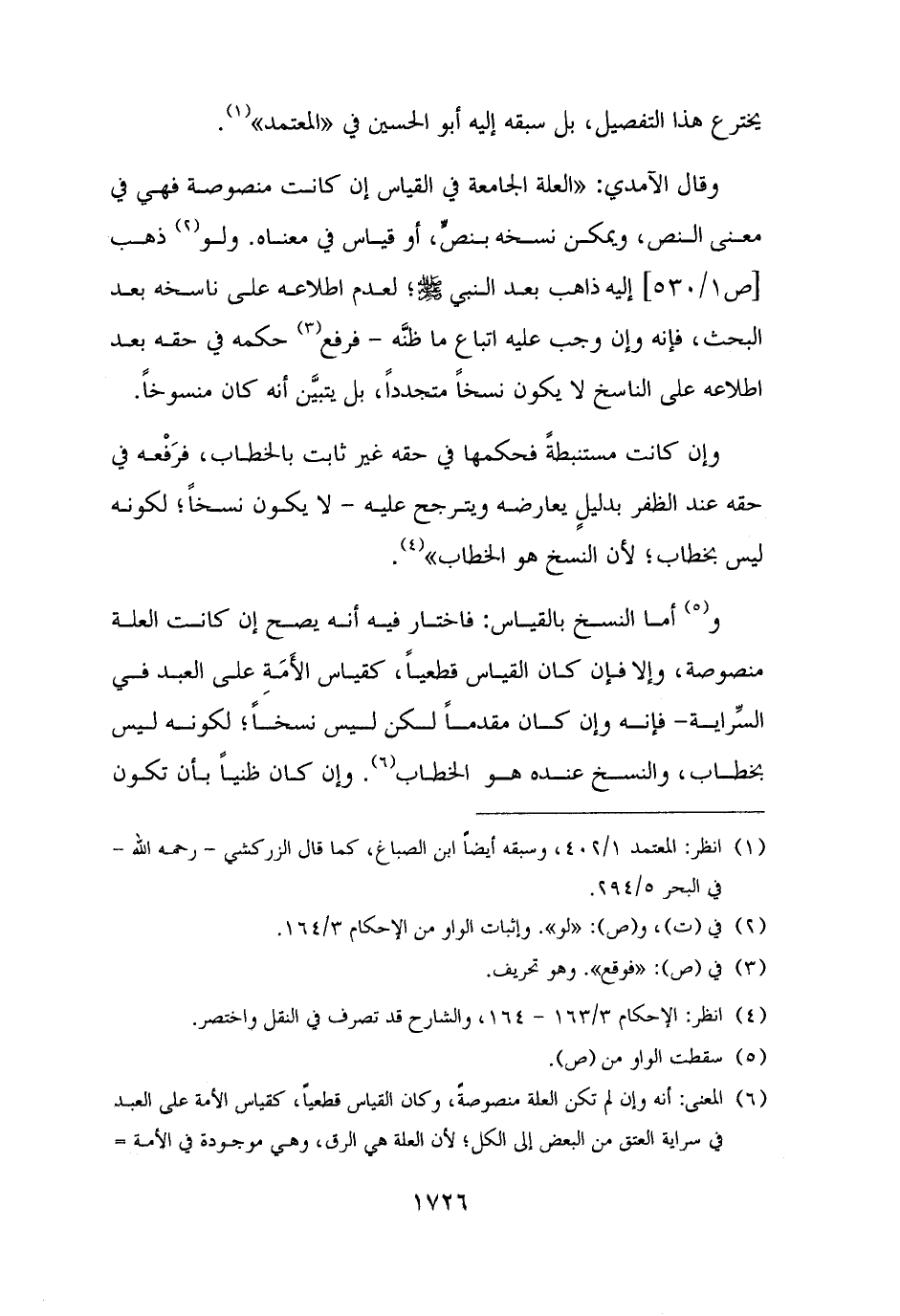 وقال الآمدي: "العلة الجامعة في القياس إن كانت منصوصة فهي في معنى النص، ويمكن نسخه بنصٍّ، أو قياس في معناه. ولو (¬٢) ذهب إليه ذاهب بعد النبي - صلى الله عليه وسلم -؛ لعدم اطلاعه على ناسخه بعد البحث، فإنه وإن وجب عليه اتباع ما ظنَّه - فرفع (¬٣) حكمه في حقه بعد اطلاعه على الناسخ لا يكون نسخًا متجددًا، بل يتبيَّن أنه كان منسوخًا.