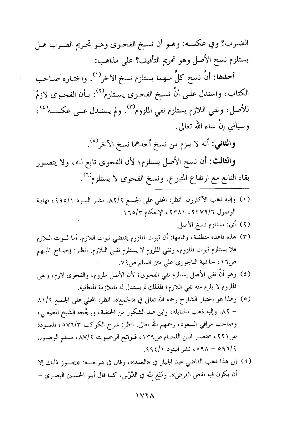 والثالث: أن نسخ الأصل يستلزم؛ لأن الفحوى تابع له، ولا يتصور بقاء التابع مع ارتفاع المتبوع. ونسخ الفحوى لا يستلزم (¬٦).