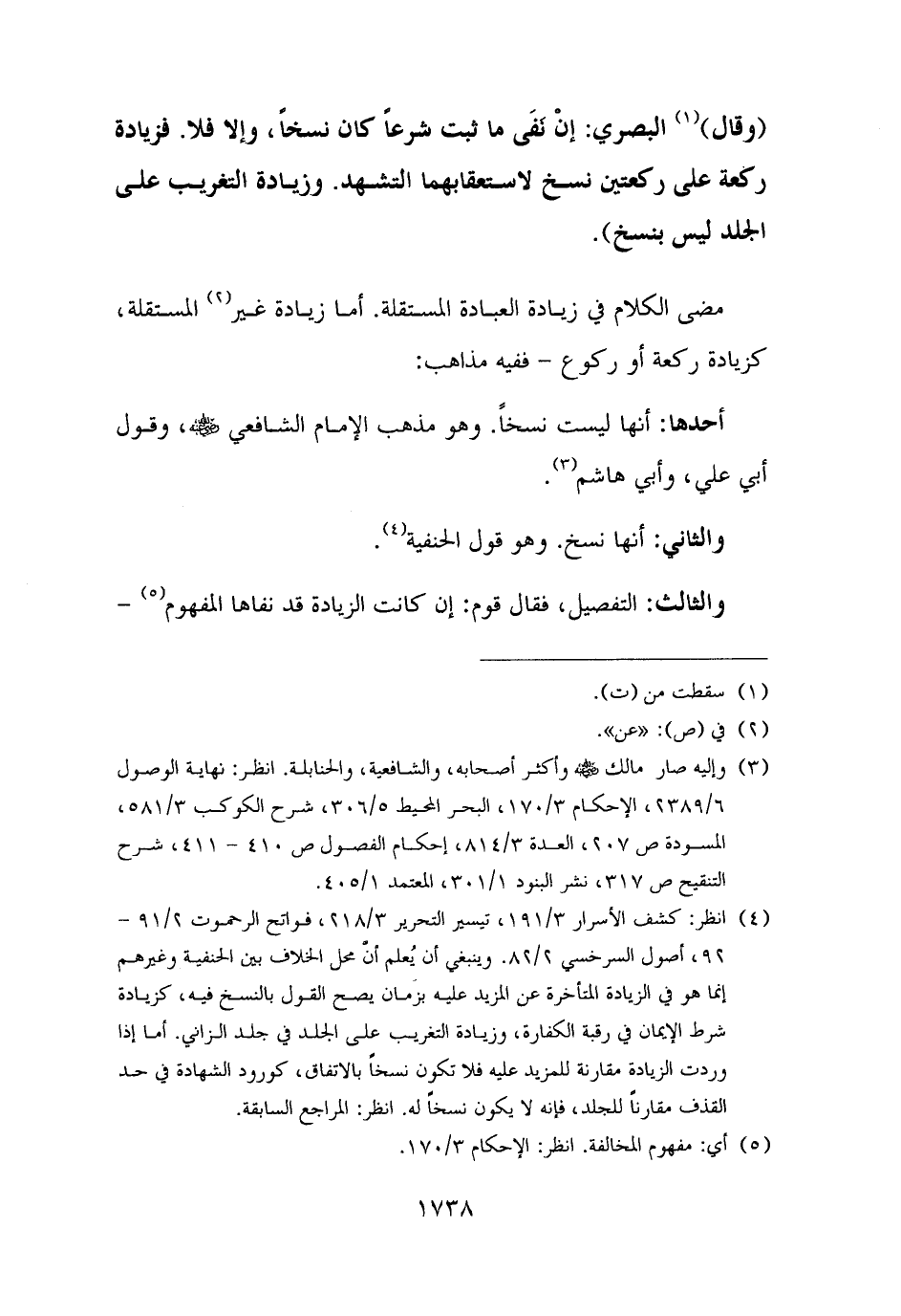 (¬٤) انظر: كشف الأسرار ٣/ ١٩١، تيسير التحرير ٣/ ٢١٨، فواتح الرحموت ٢/ ٩١ - ٩٢، أصول السرخسي ٢/ ٨٢. وينبغي أن يُعلم أن محل الخلاف بين الحنفية وغيرهم إنما هو في الزيادة المتأخرة عن المزيد عليه بزمان يصح القول بالنسخ فيه، كزيادة شرط الإيمان في رقبة الكفارة، وزيادة التغريب على الجلد في جلد الزاني. أما إذا وردت الزيادة مقارنة للمزيد عليه فلا تكون نسخًا بالاتفاق، كورود الشهادة في حد القذف مقارنًا للجلد، فإنه لا يكون نسخًا له. انظر: المراجع السابقة.