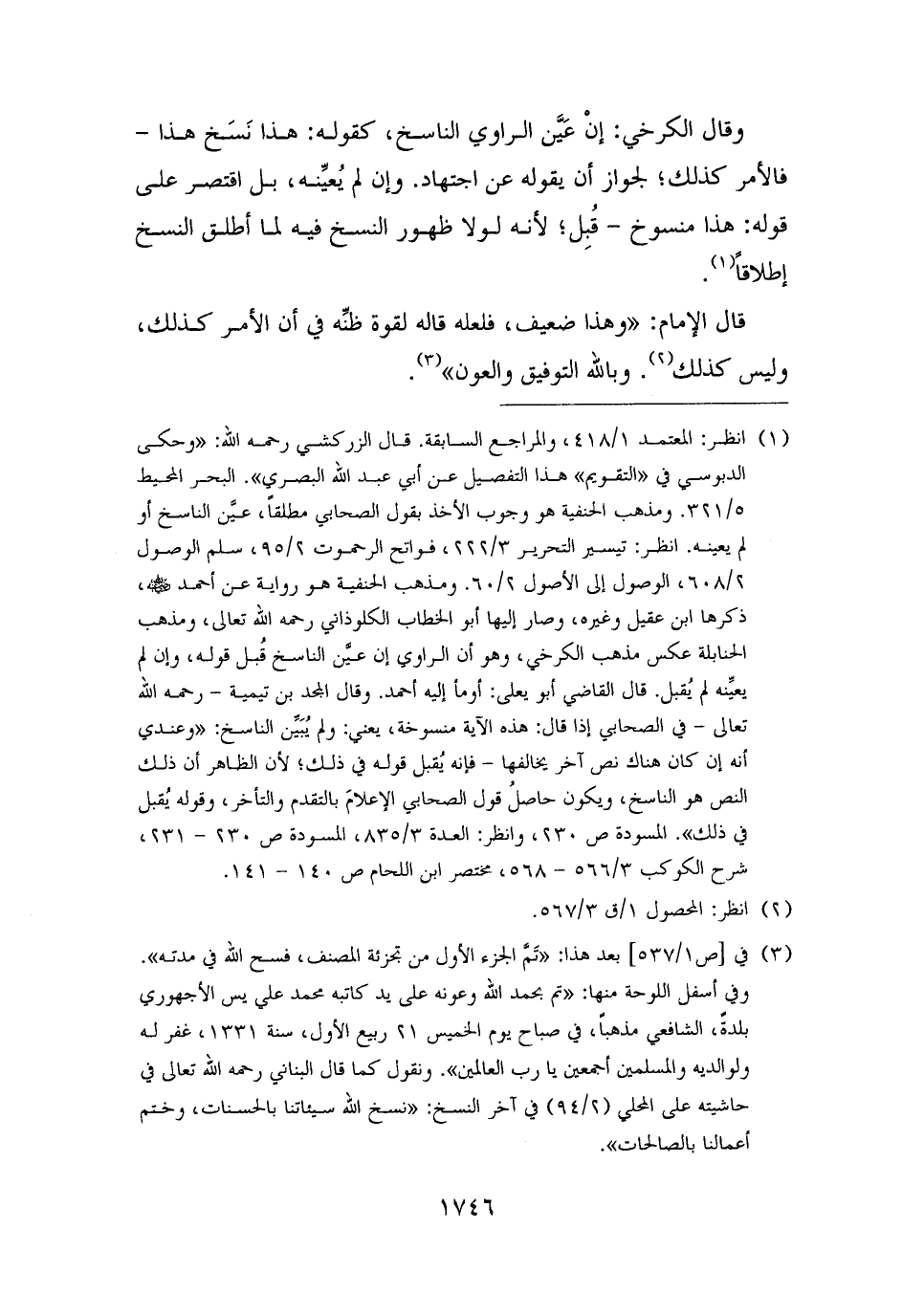 (¬١) انظر: المعتمد ١/ ٤١٨، والمراجع السابقة. قال الزركشي رحمه الله: "وحكى الدبوسي في "التقويم" هذا التفصيل عن أبي عبد الله البصري". البحر المحيط ٥/ ٣٢١. ومذهب الحنفية هو وجوب الأخذ بقول الصحابي مطلقًا، عيَّن الناسخ أو لم يعينه. انظر: تيسير التحرير ٣/ ٢٢٢، فواتح الرحموت ٢/ ٩٥، سلم الوصول ٢/ ٦٠٨، الوصول إلى الأصول ٢/ ٦٠. ومذهب الحنفية هو رواية عن أحمد - رضي الله عنه -، ذكرها ابن عقيل وغيره، وصار إليها أبو الخطاب الكلوذاني رحمه الله تعالى، ومذهب الحنابلة عكس مذهب الكرخي، وهو أن الراوي إن عيَّن الناسخ قُبل قوله، وإن لم يعيِّنه لم يُقبل. قال القاضي أبو يعلى: أومأ إليه أحمد. وقال المجد بن تيمية - رحمه الله تعالى - في الصحابي إذا قال: هذه الآية منسوخة، يعني: ولم يُبَيِّن الناسخ: "وعندي أنه إن كان هناك نص آخر يخالفها - فإنه يُقبل قوله في ذلك؛ لأن الظاهر أن ذلك النص هو الناسخ، ويكون حاصلُ قول الصحابي الإعلامَ بالتقدم والتأخر، وقوله يُقبل في ذلك". المسودة ص ٢٣٠، وانظر: العدة ٣/ ٨٣٥، المسودة ص ٢٣٠ - ٢٣١، شرح الكوكب ٣/ ٥٦٦ - ٥٦٨، مختصر ابن اللحام ص ١٤٠ - ١٤١.