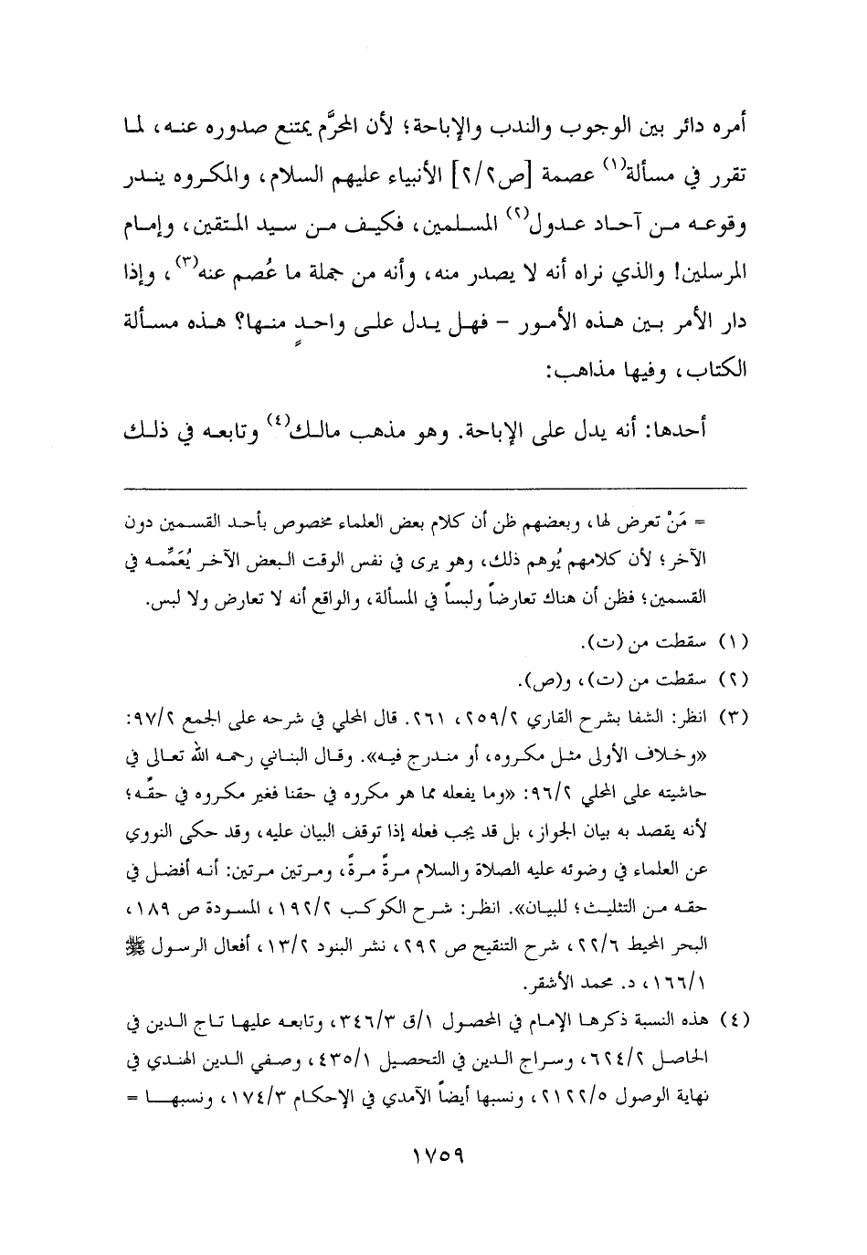 (¬٣) انظر: الشفا بشرح القاري ٢/ ٢٥٩، ٢٦١. قال المحلي في شرحه على الجمع ٢/ ٩٧: "وخلاف الأولى مثل مكروه، أو مندرج فيه". وقال البناني رحمه الله تعالى في حاشيته على المحلي ٢/ ٩٦: "وما يفعله مما هو مكروه في حقنا فغير مكروه في حقِّه؛ لأنه يقصد به بيان الجواز، بل قد يجب فعله إذا توقف البيان عليه، وقد حكى النووي عن العلماء في وضوئه عليه الصلاة والسلام مرةً مرةً، ومرتين مرتين: أنه أفضل في حقه من التثليث؛ للبيان". انظر: شرح الكوكب ٢/ ١٩٢، المسودة ص ١٨٩، البحر المحيط ٦/ ٢٢، شرح التنقيح ص ٢٩٢، نشر البنود ٢/ ١٣، أفعال الرسول - صلى الله عليه وسلم - ١/ ١٦٦، د. محمد الأشقر.