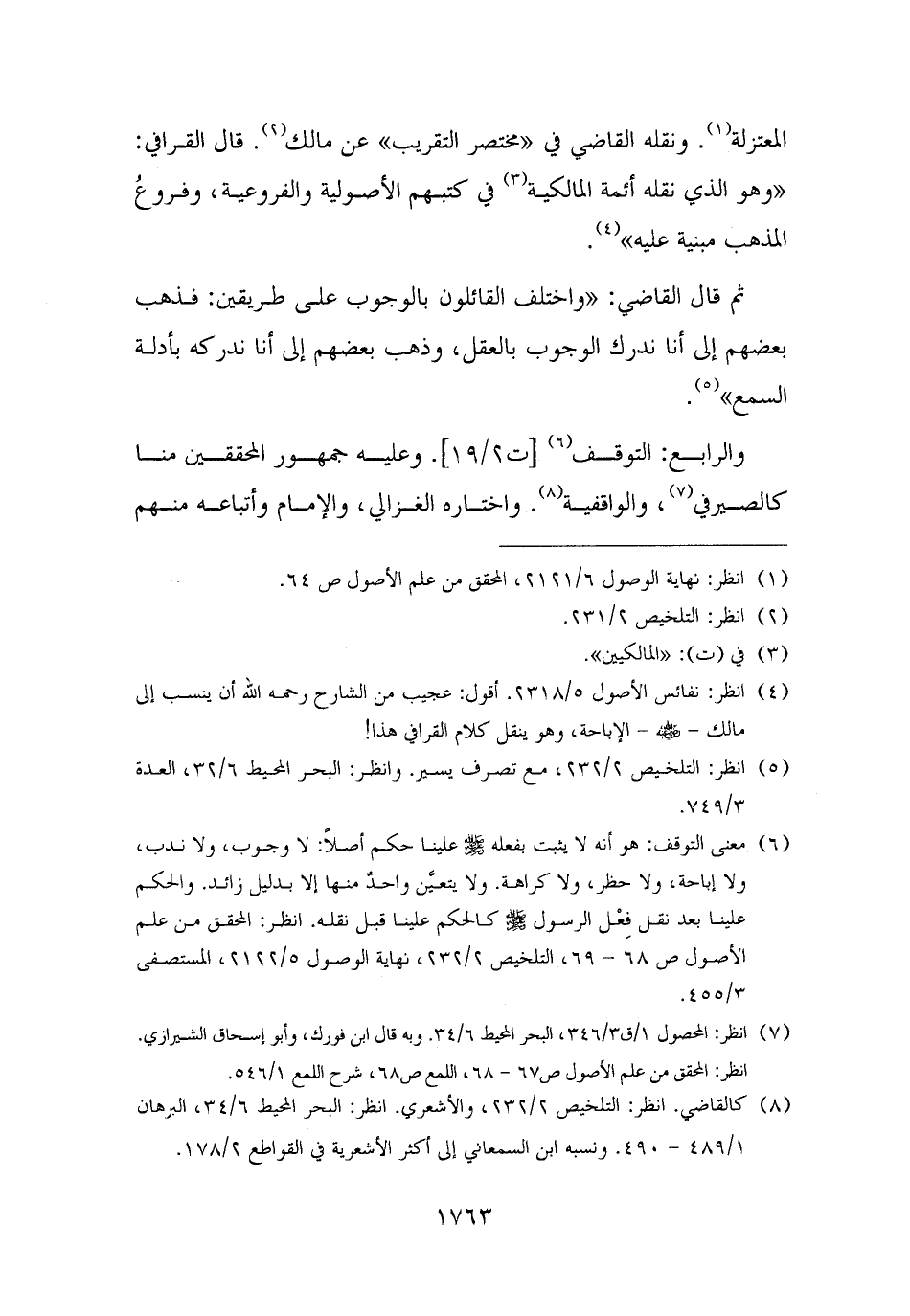 المعتزلة (¬١). ونقله القاضي في "مختصر التقريب" عن مالك (¬٢). قال القرافي: "وهو الذي نقله أئمة المالكية (¬٣) في كتبهم الأصولية والفروعية، وفروعُ المذهب مبنية عليه" (¬٤).