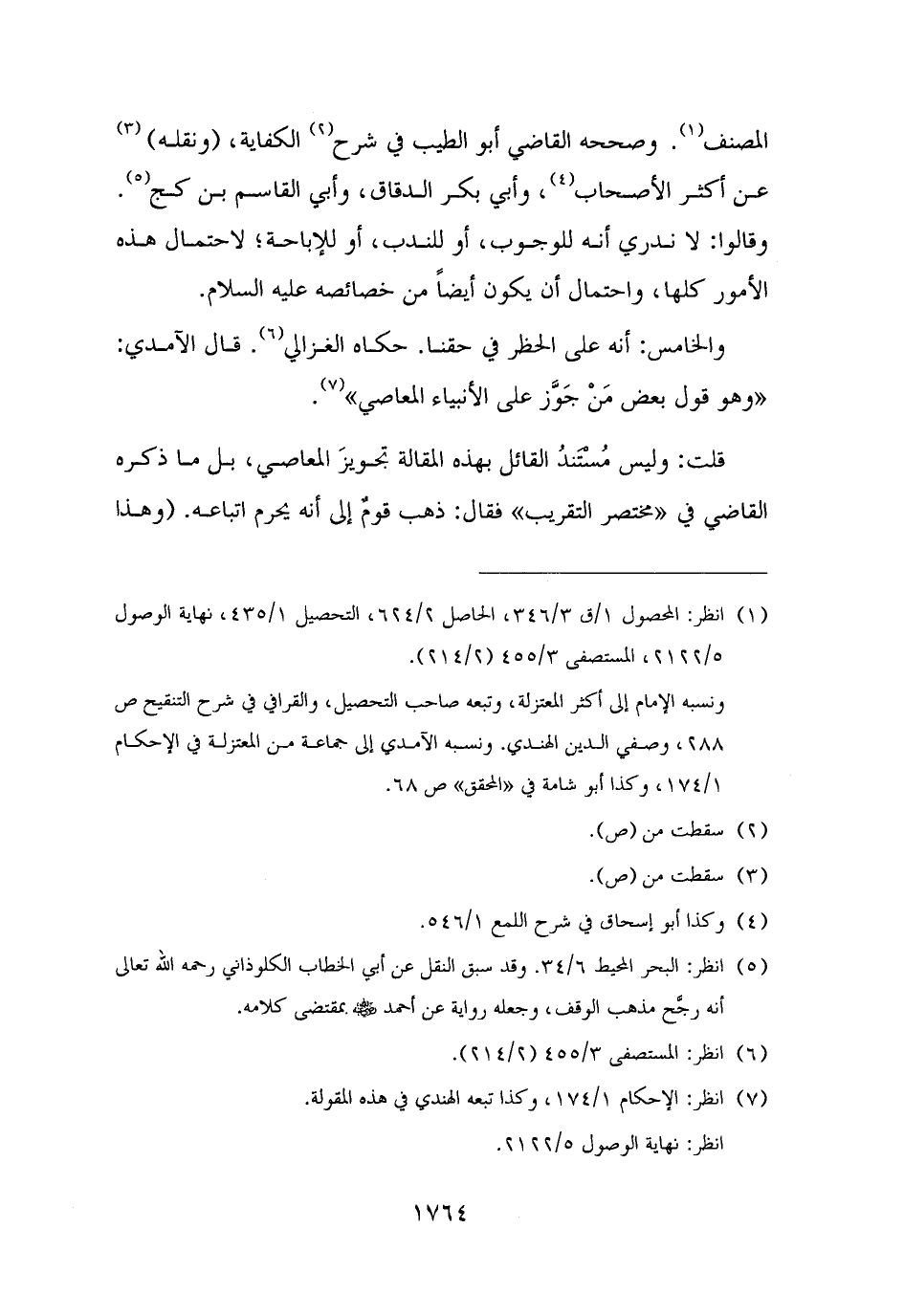 قلت: وليس مُسْتَندُ القائل بهذه المقالة تجويزَ المعاصي، بل ما ذكره القاضي في "مختصر التقريب" فقال: ذهب قومٌ إلى أنه يحرم اتباعه. (وهذا
