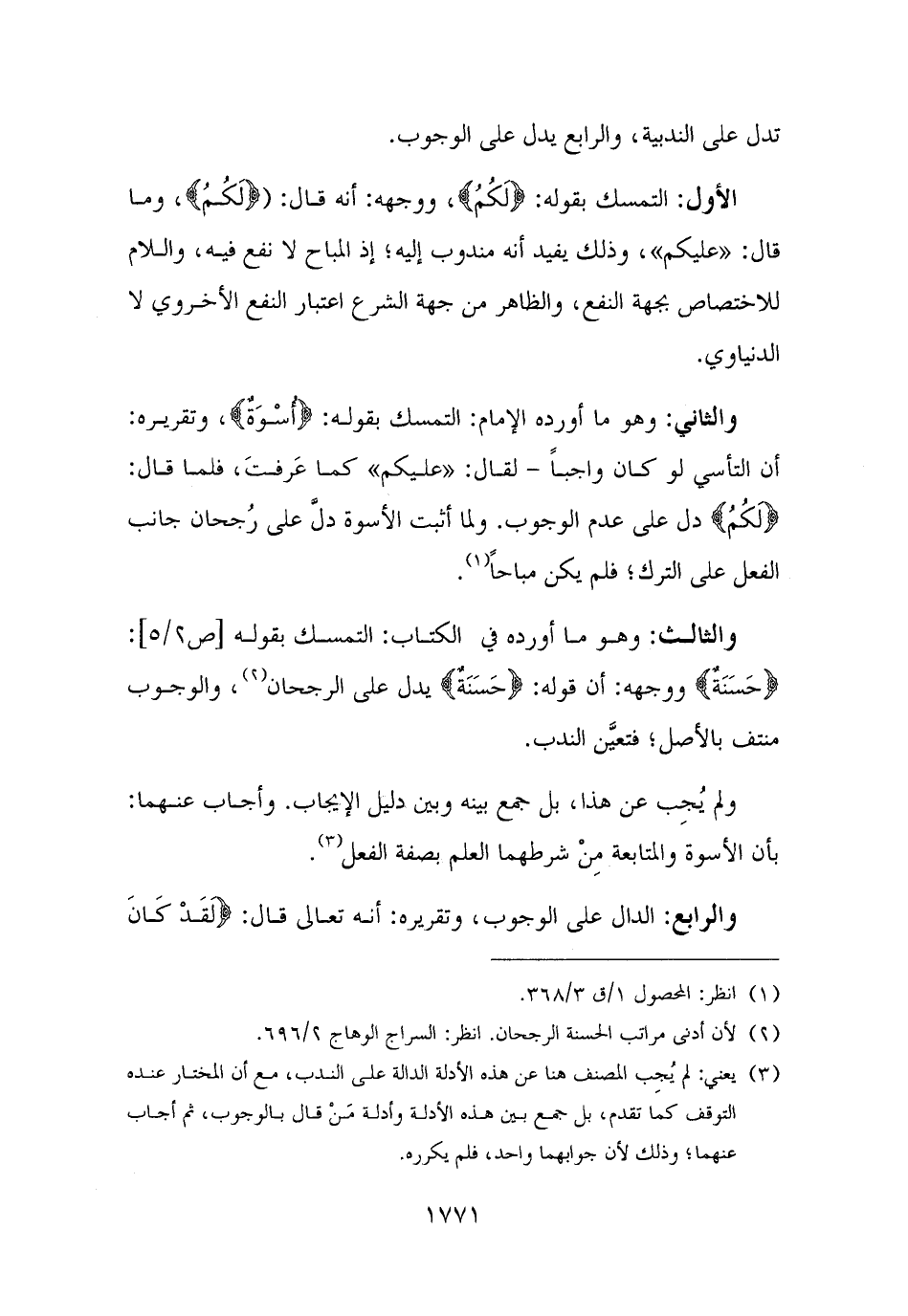 والثاني: وهو ما أورده الإمام: التمسك بقوله: {أُسْوَةٌ}، وتقريره: أن التأسي لو كان واجبًا - لقال: "عليكم" كما عَرفتَ، فلما قال: {لَكُمُ} دل على عدم الوجوب. ولا أثبت الأسوة دلَّ على رُجحان جانب الفعل على الترك؛ فلم يكن مباحًا (¬١).