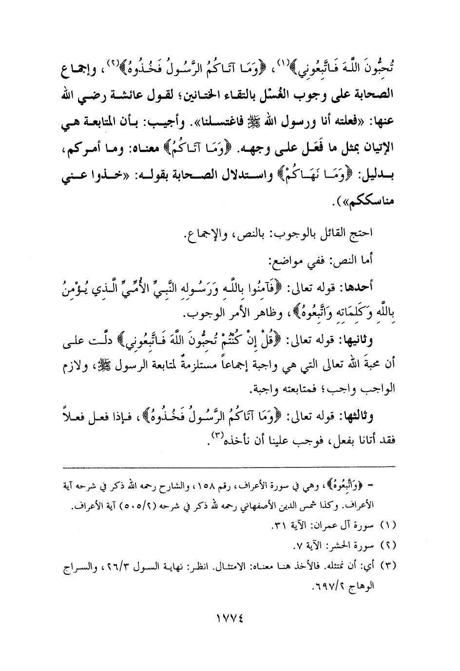 تُحِبُّونَ اللَّهَ فَاتَّبِعُونِي} (¬١)، {وَمَا آتَاكُمُ الرَّسُولُ فَخُذُوهُ} (¬٢)، وإجماع الصحابة على وجوب الغُسْل بالتقاء الختانين؛ لقول عائشة رضي الله عنها: "فعلته أنا ورسول الله - صلى الله عليه وسلم - فاغتسلنا". وأجيب: بأن المتابعة هي الإتيان بمثل ما فَعَل على وجهه. {وَمَا آتَاكُمُ} معناه: وما أمركم، بدليل: {وَمَا نَهَاكُمْ} واستدلال الصحابة بقوله: "خذوا عني مناسككم").