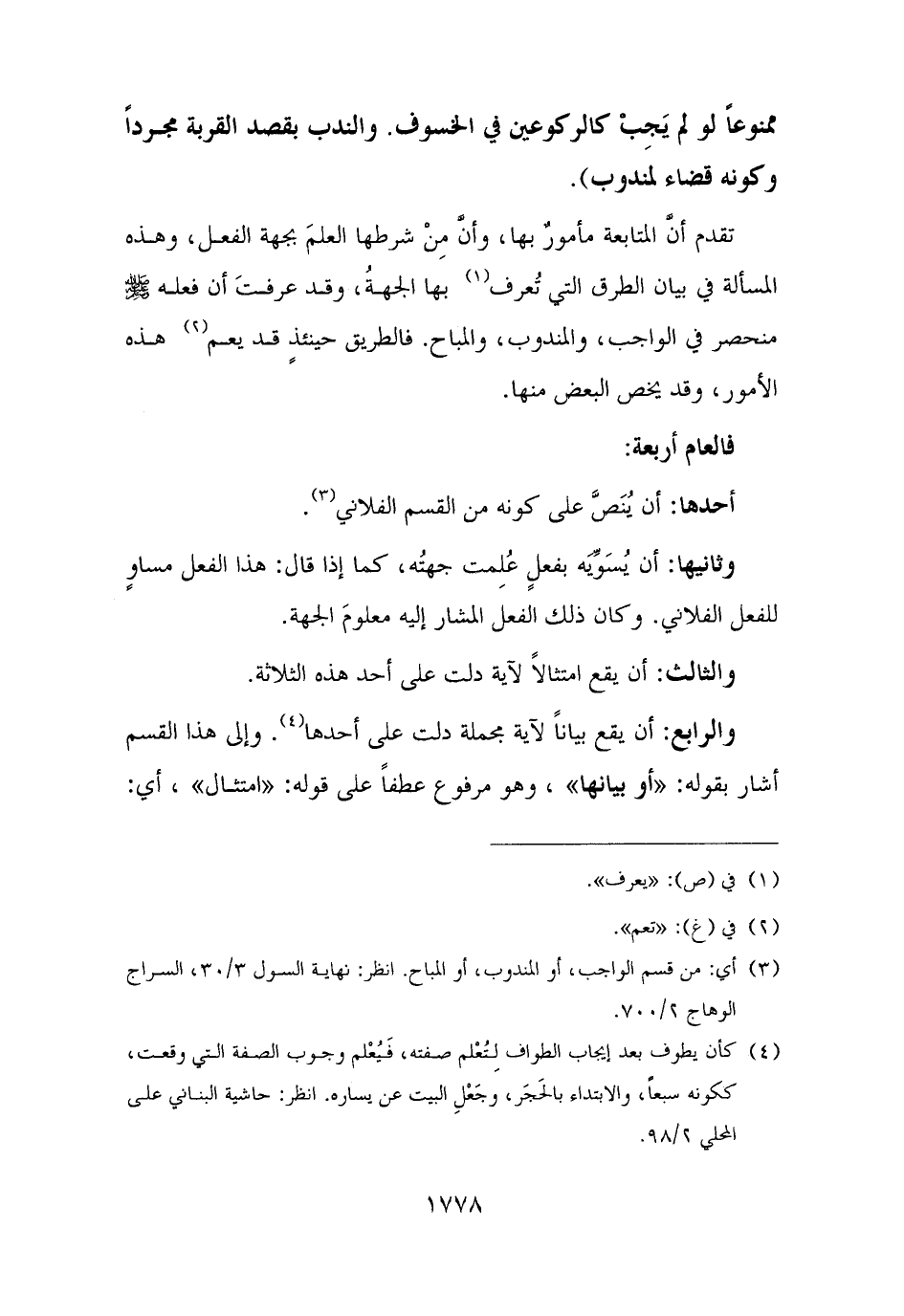 (¬٤) كأن يطوف بعد إيجاب الطواف لِتُعْلم صفته، فَيُعْلم وجوب الصفة التي وقعت، ككونه سبعًا، والابتداء بالحَجَر، وجَعْلِ البيت عن يساره. انظر: حاشية البناني على المحلي ٢/ ٩٨.