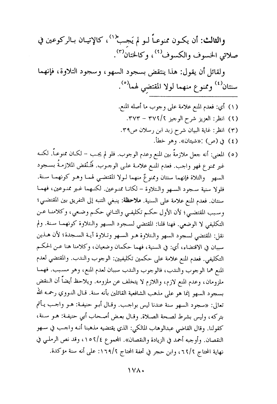 (¬٥) المعنى: أنه جعل ملازمةً بين المنع وعدم الوجوب. فلو لم يجب - لكان ممنوعًا. لكنه غير ممنوع فهو واجب. فعدم المنع علامة على الوجوب. فَتُنْقض الملازمة بسجود السهو والتلاوة فإنهما سنتان وممنوعٌ منهما لولا المقتضي لهما وهو كونهما سنة. فلولا سنية سجود السهو والتلاوة - لكانا ممنوعين. لكنهما غير ممنوعين، فهما سنتان. فعدم المنع علامة على السنية. ملاحظة: ينبغي التنبه إلى التفريق بين المقتضي؛ وسبب المقتضي؛ لأن الأول حكم تكليفي والثاني حكم وضعي، وكلامنا عن التكليفي لا الوضعي. فهنا قلنا: المقتضي لسجود السهو والتلاوة كونهما سنة. ولم نقل: المقتضي لسجود السهو والتلاوة هو السهو وتلاوة آية السجدة؛ لأن هذين سببان في الاقتضاء، أي: في السنية، فهما حكمان وضعيان، وكلامنا هنا عن الحكم التكليفي. فعدم المنع علامة على حكمين تكليفيين: الوجوب والندب. والمقتضي لعدم المنع هما الوجوب والندب، فالوجوب والندب سببان لعدم المنع، وهو مسبب. فهما ملزومان، وعدم المنع لازم، واللازم لا يتخلف عن ملزومه. ويلاحظ أيضًا أن النقض بسجود السهو إنما هو على مذهب الشافعية القائلين بأنه سنة. قال النووي رحمه الله تعالى: "سجود السهو سنة عندنا ليس بواجب. وقال أبو حنيفة: هو واجب يأثم بتركه، وليس بشرط لصحة الصلاة. وقال بعض أصحاب أبي حنيفة: هو سنة، كقولنا. وقال القاضي عبد الوهاب المالكي: الذي يقتضيه مذهبنا أنه واجب في سهو النقصان. وأوجبه أحمد في الزيادة والنقصان". المجموع ٤/ ١٥٢، وقد نص الرملي في نهاية المحتاج ٢/ ٦٢، وابن حجر في تحفة المحتاج ٢/ ١٦٩: على أنه سنة مؤكدة.