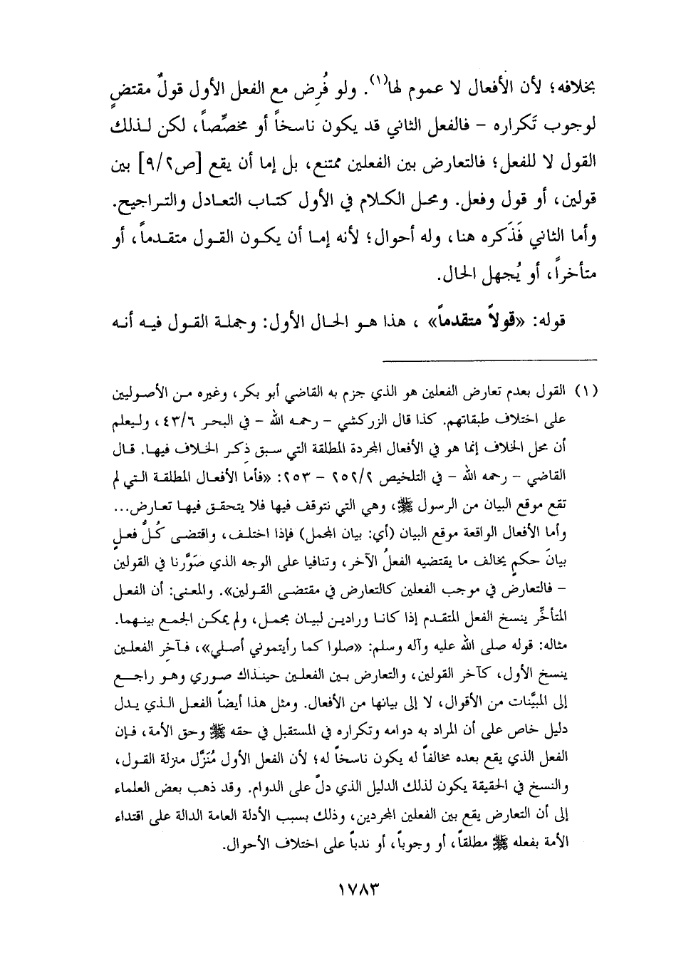 (¬١) القول بعدم تعارض الفعلين هو الذي جزم به القاضي أبو بكر، وغيره من الأصوليين على اختلاف طبقاتهم. كذا قال الزركشي - رحمه الله - في البحر ٦/ ٤٣، وليعلم أن محل الخلاف إنما هو في الأفعال المجردة المطلقة التي سبق ذكر الخلاف فيها. قال القاضي - رحمه الله - في التلخيص ٢/ ٢٥٢ - ٢٥٣: "فأما الأفعال المطلقة التي لم تقع موقع البيان من الرسول - صلى الله عليه وسلم -، وهي التي نتوقف فيها فلا يتحقق فيها تعارض. . . وأما الأفعال الواقعة موقع البيان (أي: بيان المجمل) فإذا اختلف، واقتضى كُلُّ فعلٍ بيانَ حكمٍ يخالف ما يقتضيه الفعلُ الآخر، وتنافيا على الوجه الذي صَوَّرنا في القولين - فالتعارض في موجب الفعلين كالتعارض في مقتضى القولين". والمعنى: أن الفعل المتأخِّر ينسخ الفعل المتقدم إذا كانا ورادين لبيان مجمل، ولم يمكن الجمع بينهما. مثاله: قوله صلى الله عليه وآله وسلم: "صلوا كما رأيتموني أصلي"، فآخِر الفعلين ينسخ الأول، كآخر القولين، والتعارض بين الفعلين حينذاك صوري وهو راجع إلى المبيَّنات من الأقوال، لا إلى بيانها من الأفعال. ومثل هذا أيضًا الفعل الذي يدل دليل خاص على أن المراد به دوامه وتكراره في المستقبل في حقه - صلى الله عليه وسلم - وحق الأمة، فإن الفعل الذي يقع بعده مخالفًا له يكون ناسخًا له؛ لأن الفعل الأول مُنَزَّل منزلة القول، والنسخ في الحقيقة يكون لذلك الدليل الذي دلَّ على الدوام. وقد ذهب بعض العلماء إلى أن التعارض يقع بين الفعلين المجردين، وذلك بسبب الأدلة العامة الدالة على اقتداء الأمة بفعله - صلى الله عليه وسلم - مطلقًا، أو وجوبًا، أو ندبًا على اختلاف الأحوال.