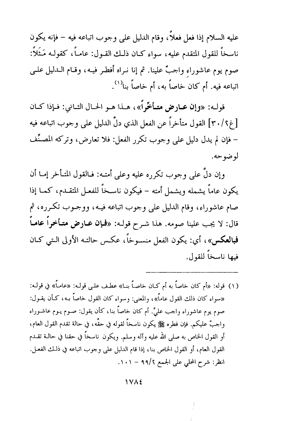 (¬١) قوله: "أم كان خاصًا به أم كان خاصًا بنا" عطف على قوله: "عامًا" في قوله: "سواء كان ذلك القول عامًا"، والمعنى: وسواء كان القول خاصًا به، كأن يقول: صوم يوم عاشوراء واجب عليَّ. أم كان خاصًا بنا، كأن يقول: صوم يوم عاشوراء واجبٌ عليكم. فإن فطره - صلى الله عليه وسلم - يكون ناسخًا لقوله في حقِّه، في حالة تقدم القول العام، أو القول الخاص به صلى الله عليه وآله وسلم. ويكون ناسخًا في حقنا في حالة تقدم القول العام، أو القول الخاص بنا، إذا قام الدليل على وجوب اتباعه في ذلك الفعل. انظر: شرح المحلي على الجمع ٢/ ٩٩ - ١٠١.