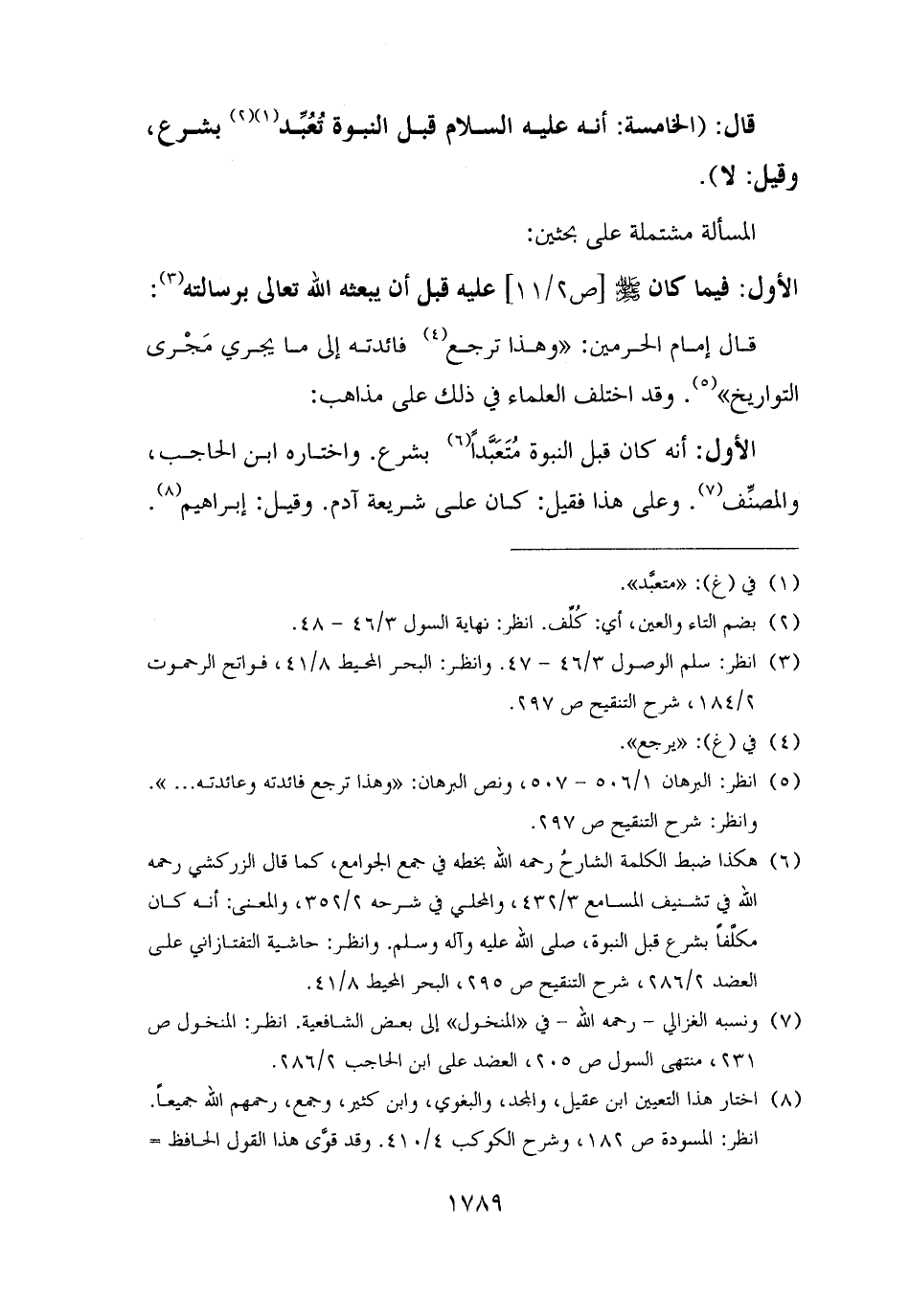 (¬٦) هكذا ضبط الكلمة الشارحُ رحمه الله بخطه في جمع الجوامع، كما قال الزركشي رحمه الله في تشنيف المسامع ٣/ ٤٣٢، والمحلي في شرحه ٢/ ٣٥٢، والمعنى: أنه كان مكلَّفًا بشرع قبل النبوة، صلى الله عليه وآله وسلم. وانظر: حاشية التفتازاني على العضد ٢/ ٢٨٦، شرح التنقيح ص ٢٩٥، البحر المحيط ٨/ ٤١.