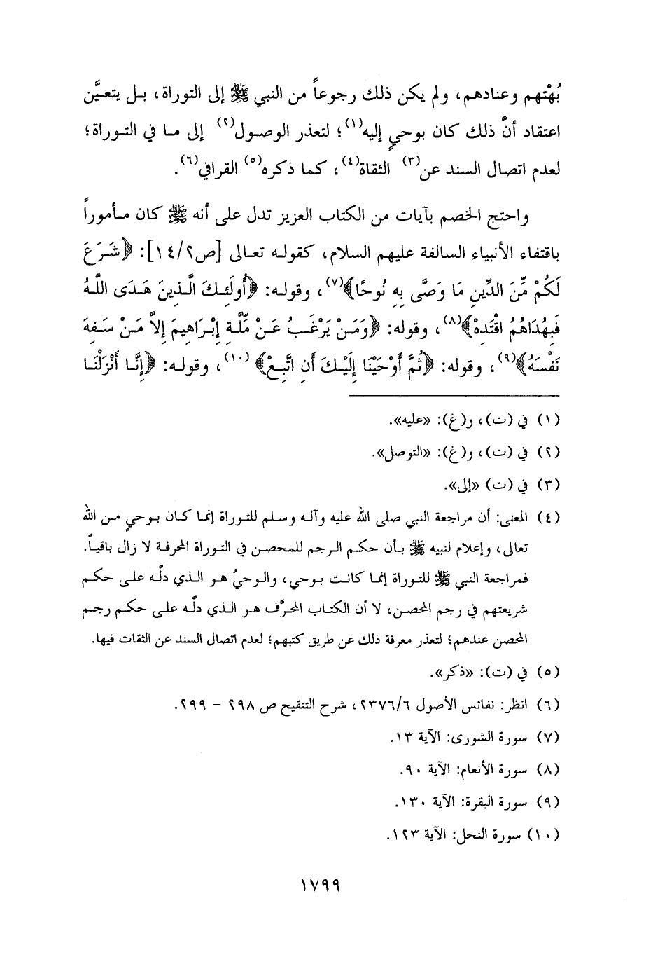 بُهْتهم وعنادهم، ولم يكن ذلك رجوعًا من النبي - صلى الله عليه وسلم - إلى التوراة، بل يتعيَّن اعتقاد أنَّ ذلك كان بوحي إليه (¬١)؛ لتعذر الوصول (¬٢) إلى ما في التوراة؛ لعدم اتصال السند عن (¬٣) الثقاة (¬٤)، كما ذكره (¬٥) القرافي (¬٦).