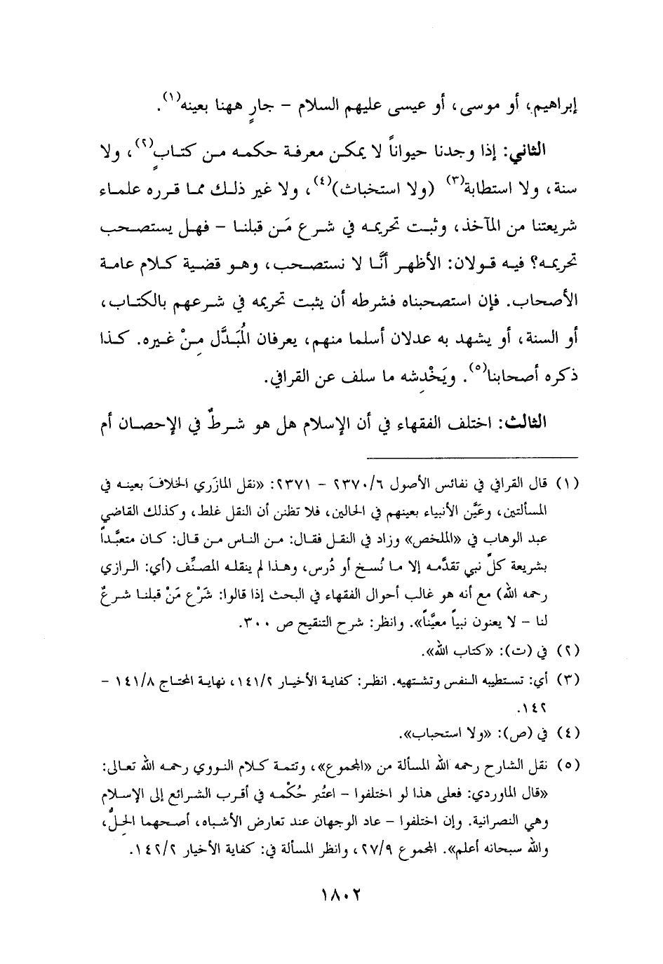 (¬١) قال القرافي في نفائس الأصول ٦/ ٢٣٧٠ - ٢٣٧١: "نقل المازَري الخلافَ بعينه في المسألتين، وعَيَّن الأنبياء بعينهم في الحالين، فلا تظنن أن النقل غلط، وكذلك القاضي عبد الوهاب في "الملخص" وزاد في النقل فقال: من الناس من قال: كان متعبَّدًا بشريعة كلِّ نبي تقدَّمه إلا ما نُسخ أو دُرس، وهذا لم ينقله المصنِّف (أي: الرازي رحمه الله) مع أنه هو غالب أحوال الفقهاء في المبحث إذا قالوا: شَرْع مَنْ قبلنا شرعٌ لنا - لا يعنون نبيًا معيَّنًا". وانظر: شرح التنقيح ص ٣٠٠.