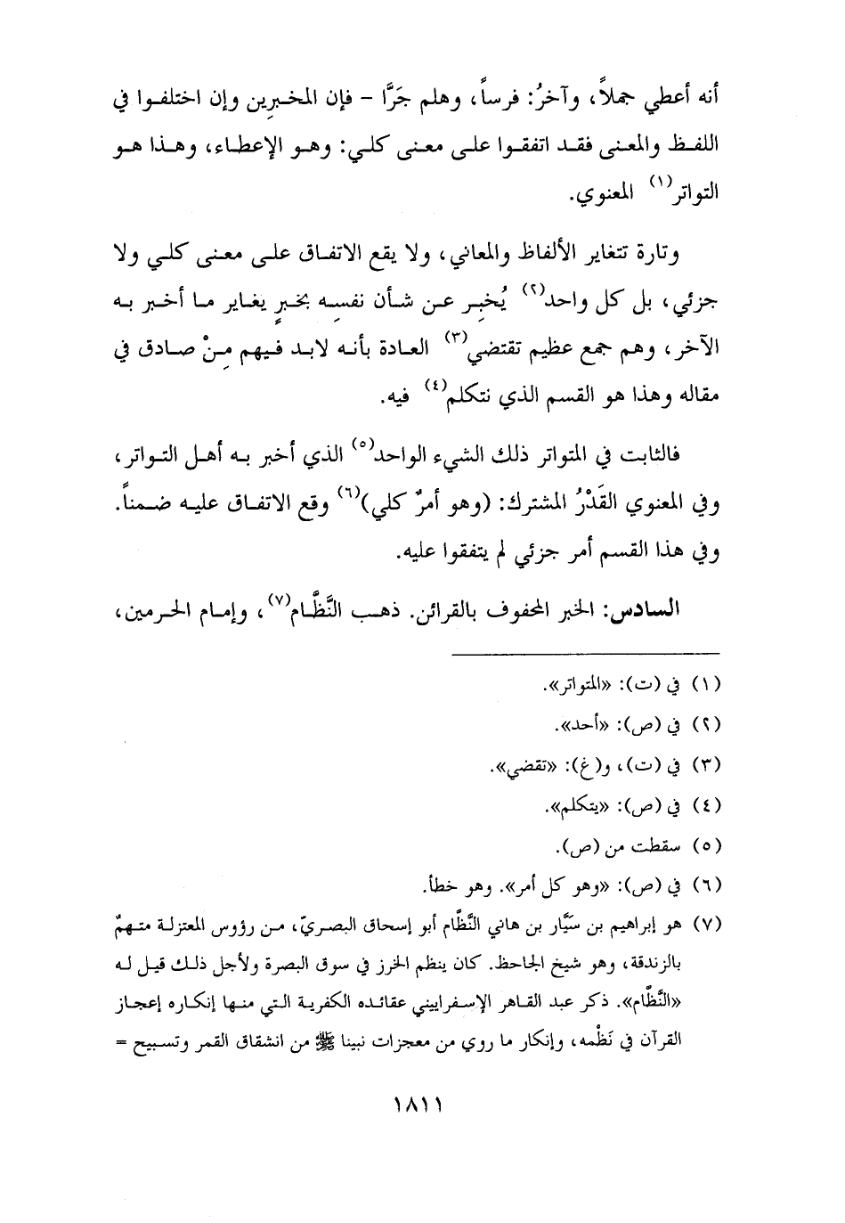 (¬٧) هو إبراهيم بن سَيَّار بن هاني النَّظَّام أبو إسحاق البصريّ، من رؤوس المعتزلة متهمٌ بالزندقة، وهو شيخ الجاحظ. كان ينظم الخرز في سوق البصرة ولأجل ذلك قيل له "النَّظَّام". ذكر عبد القاهر الإسفراييني عقائده الكفرية التي منها إنكاره إعجاز القرآن في نَظْمه، وإنكار ما روي من معجزات نبينا - صلى الله عليه وسلم - من انشقاق القمر وتسبيح =