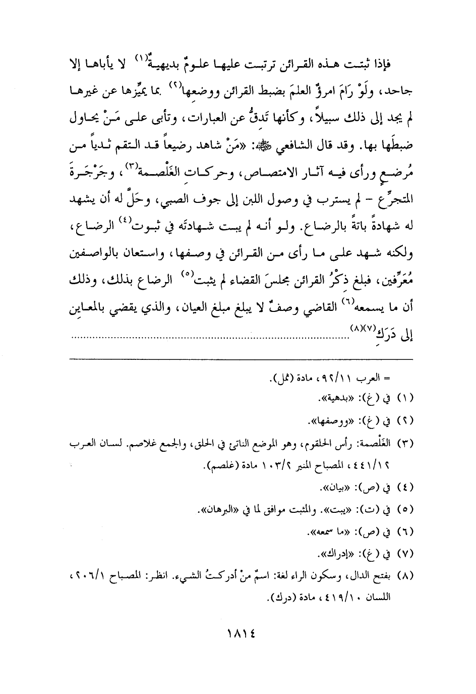 فإذا ثبتت هذه القرائن ترتبت عليها علومٌ بديهيةٌ (¬١) لا يأباها إلا جاحد، ولَوْ رَامَ امرؤٌ العلمَ بضبط القرائن ووضعِها (¬٢) بما يميِّزها عن غيرها لم يجد إلى ذلك سبيلًا، وكأنها تَدِقُّ عن العبارات، وتأبى على مَنْ يحاول ضبطَها بها. وقد قال الشافعي - رضي الله عنه -: "مَنْ شاهد رضيعًا قد التقم ثديًا من مُرضع ورأى فيه آثار الامتصاص، وحركاتِ الغَلْصمة (¬٣)، وجَرْجَرةَ المتجرِّع - لم يسترب في وصول اللبن إلى جوف الصبي، وحَلَّ له أن يشهد له شهادةً باتةً بالرضاع. ولو أنه لم يبت شهادتَه في ثبوت (¬٤) الرضاع، ولكنه شهد على ما رأى من القرائن في وصفها، واستعان بالواصفين مُعَرِّفين، فبلغ ذِكْرُ القرائن مجلسَ القضاء لم يثبت (¬٥) الرضاع بذلك، وذلك أن ما يسمعه (¬٦) القاضي وصفٌ لا يبلغ مبلغ العيان، والذي يقضي بالمعايِن إلى دَرَكِ (¬٧) (¬٨). . . . . . . . . . . . . . . . . . . . . . . .