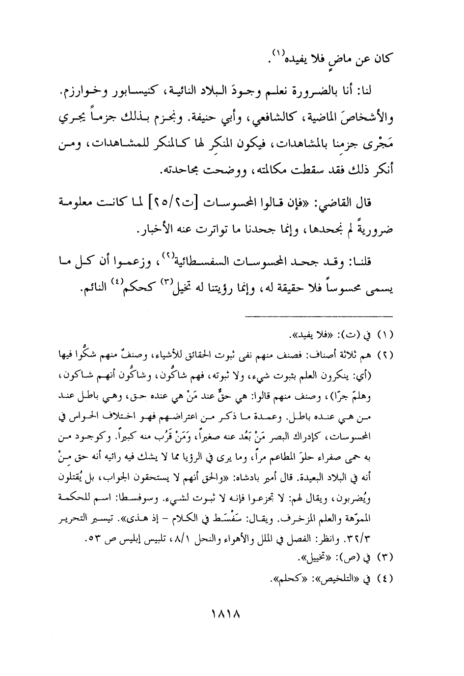 قلنا: وقد جحد المحسوسات السفسطائية (¬٢)، وزعموا أن كل ما يسمى محسوسًا فلا حقيقة له، وإنما رؤيتنا له تخيل (¬٣) كحكم (¬٤) النائم.
