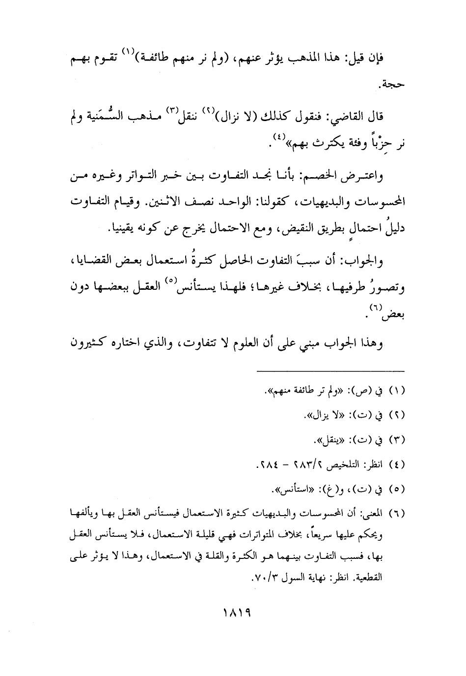 (¬٦) المعنى: أن المحسوسات والبديهيات كثيرة الاستعمال فيستأنس العقل بها ويألفها ويحكم عليها سريعًا، بخلاف المتواترات فهي قليلة الاستعمال، فلا يستأنس العقل بها، فسبب التفاوت بينهما هو الكثرة والقلة في الاستعمال، وهذا لا يؤثر على القطعية. انظر: نهاية السول ٣/ ٧٠.