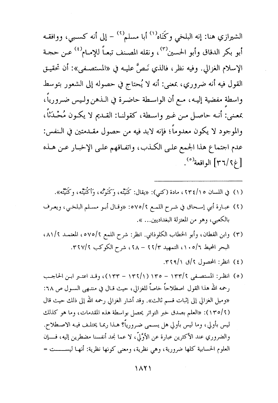 الشيرازي هنا: إنه البلخي وكَنَاه (¬١) أبا مسلم (¬٢) - إلى أنه كسبي، ووافقه أبو بكر الدقاق وأبو الحسين (¬٣)، ونقله المصنف تبعًا للإمام (¬٤) عن حجة الإسلام الغزالي. وفيه نظر، فالذي نَصَّ عليه في "المستصفى": أن تحقيق القول فيه أنه ضروري، بمعنى: أنه لا يُحتاج في حصوله إلى الشعور بتوسط واسطةٍ مفضية إليه، مع أن الواسطة حاضرة في الذهن وليس ضروريًا، بمعنى: أنه حاصل من غير واسطة، كقولنا: القديم لا يكون مُحْدَثًا، والوجود لا يكون معدومًا؛ فإنه لا بد فيه من حصول مقدمتين في النفس: عدم اجتماع هذا الجمع على الكذب، واتفاقهم على الإخبار عن هذه الواقعة (¬٥).