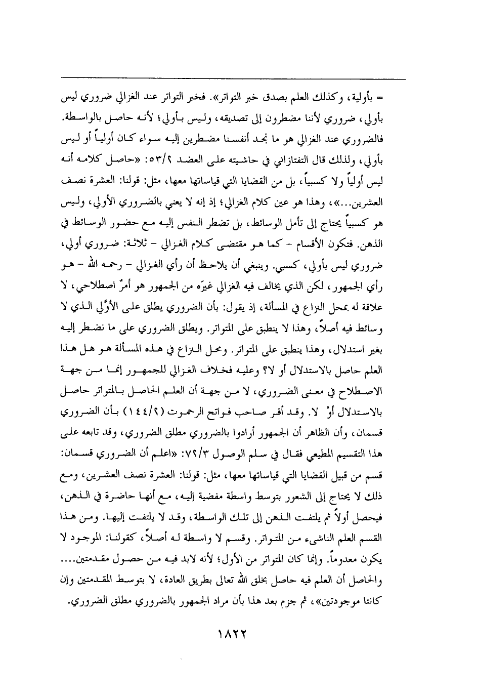 = بأولية، وكذلك العلم بصدق خبر التواتر". فخبر التواتر عند الغزالي ضروري ليس بأولي، ضروري لأننا مضطرون إلى تصديقه، وليس بأولي؛ لأنه حاصل بالواسطة. فالضروري عند الغزالي هو ما نجد أنفسنا مضطرين إليه سواء كان أوليًا أو ليس بأولي، ولذلك قال التفتازاني في حاشيته على العضد ٢/ ٥٣: "حاصل كلامه أنه ليس أوليًا ولا كسبيًا، بل من القضايا التي قياساتها معها، مثل: قولنا: العشرة نصف العشرين. . ."، وهذا هو عين كلام الغزالي؛ إذ إنه لا يعني بالضروري الأولي، وليس هو كسبيًا يحتاج إلى تأمل الوسائط، بل تضطر النفس إليه مع حضور الوسائط في الذهن. فتكون الأقسام - كما هو مقتضى كلام الغزالي - ثلاثة: ضروري أولي، ضروري ليس بأولي، كسبي. وينبغي أن يلاحظ أن رأي الغزالي - رحمه الله - هو رأي الجمهور، لكن الذي يخالف فيه الغزالي غيرَه من الجمهور هو أمرٌ اصطلاحي، لا علاقة له بمحل النزاع في المسألة، إذ يقول: بأن الضروري يطلق على الأوَّلي الذي لا وسائط فيه أصلًا، وهذا لا ينطبق على المتواتر. ويطلق الضروري على ما نضطر إليه بغير استدلال، وهذا ينطبق على المتواتر. ومحل النزاع في هذه المسألة هو هل هذا العلم حاصل بالاستدلال أو لا؟ وعليه فخلاف الغزالي للجمهور إنما من جهة الاصطلاح في معنى الضروري، لا من جهة أن العلم الحاصل بالمتواتر حاصل بالاستدلال أوْ لا. وقد أقر صاحب فواتح الرحموت (٢/ ١٤٤) بأن الضروري قسمان، وأن الظاهر أن الجمهور أرادوا بالضروري مطلق الضروري، وقد تابعه على هذا التقسيم المطيعي فقال في سلم الوصول ٣/ ٧٢: "اعلم أن الضروري قسمان: قسم من قبيل القضايا التي قياساتها معها، مثل: قولنا: العشرة نصف العشرين، ومع ذلك لا يحتاج إلى الشعور بتوسط واسطة مفضية إليه، مع أنها حاضرة في الذهن، فيحصل أولًا ثم يلتفت الذهن إلى تلك الواسطة، وقد لا يلتفت إليها. ومن هذا القسم العلم الناشئ من المتواتر. وقسم لا واسطة له أصلًا، كقولنا: الموجود لا يكون معدومًا. وإنما كان المتواتر من الأول؛ لأنه لا بد فيه من حصول مقدمتين. . . . والحاصل أن العلم فيه حاصل بخلق الله تعالى بطريق العادة، لا بتوسط المقدمتين وإن كانتا موجودتين"، ثم جزم بعد هذا بأن مراد الجمهور بالضروري مطلق الضروري.