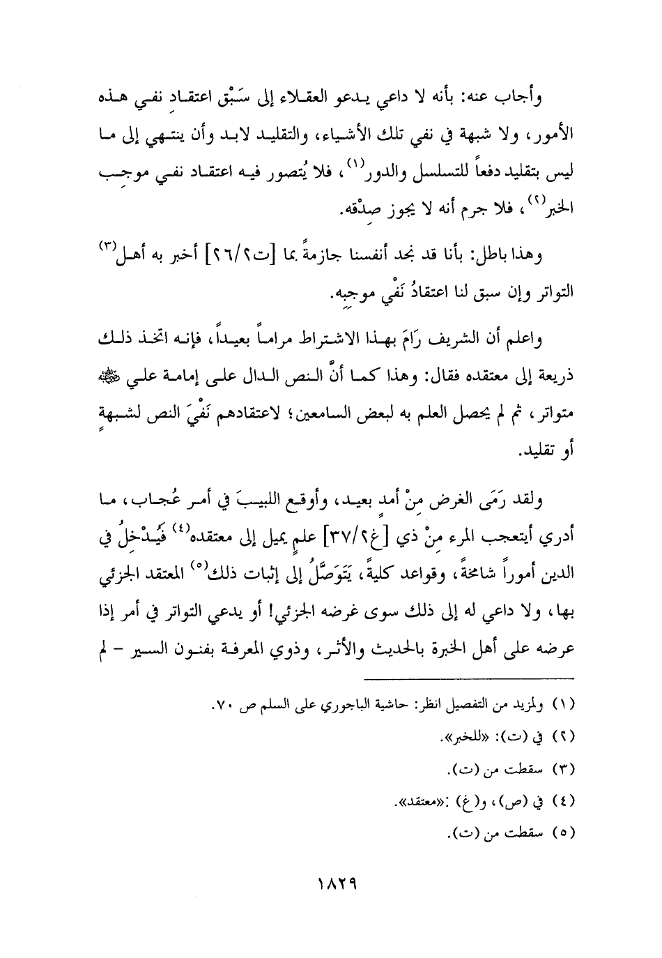 وأجاب عنه: بأنه لا داعي يدعو العقلاء إلى سَبْق اعتقادِ نفي هذه الأمور، ولا شبهة في نفي تلك الأشياء، والتقليد لا بد وأن ينتهي إلى ما ليس بتقليد دفعًا للتسلسل والدور (¬١)، فلا يُتصور فيه اعتقاد نفي موجِب الخبر (¬٢)، فلا جرم أنه لا يجوز صِدْقه.