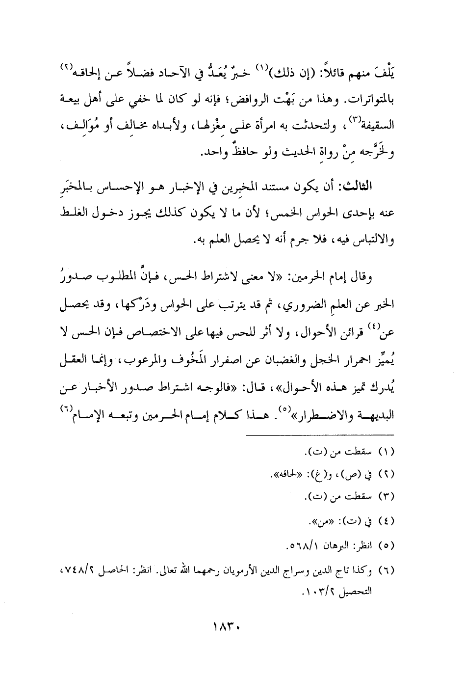 وقال إمام الحرمين: "لا معنى لاشتراط الحس، فإنَّ المطلوب صدورُ الخبر عن العلمِ الضروري، ثم قد يترتب على الحواس ودَرْكها، وقد يحصل عن (¬٤) قرائن الأحوال، ولا أثر للحس فيها على الاختصاص فإن الحس لا يُميِّز احمرار الخجل والغضبان عن اصفرار المَخُوف والمرعوب، وإنما العقل يُدرك تميز هذه الأحوال"، قال: "فالوجه اشتراط صدور الأخبار عن البديهة والاضطرار" (¬٥). هذا كلام إمام الحرمين وتبعه الإمام (¬٦)