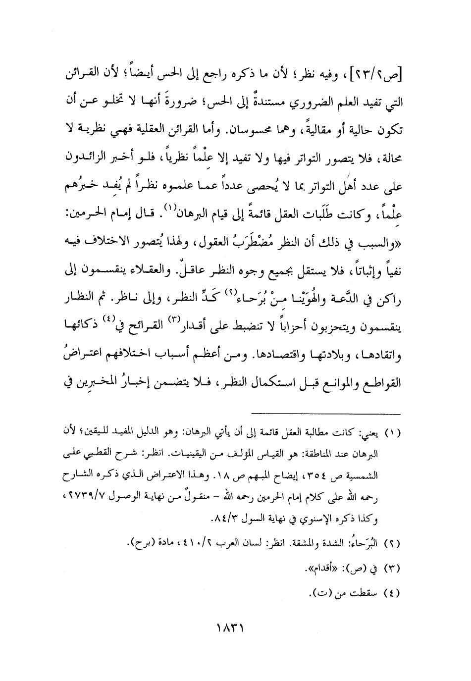 وفيه نظر؛ لأن ما ذكره راجع إلى الحس أيضًا؛ لأن القرائن التي تفيد العلم الضروري مستندةٌ إلى الحس؛ ضرورةَ أنها لا تخلو عن أن تكون حالية أو مقاليةً، وهما محسوسان. وأما القرائن العقلية فهي نظرية لا محالة، فلا يتصور التواتر فيها ولا تفيد إلا عِلْمًا نظريًا، فلو أخبر الزائدون على عدد أهل التواتر بما لا يُحصى عددًا عما علموه نظرًا لم يُفِد خبرُهم عِلْمًا، وكانت طَلَبات العقل قائمةً إلى قيام البرهان (¬١). قال إمام الحرمين: "والسبب في ذلك أن النظر مُضْطَرَبُ العقول، ولهذا يُتصور الاختلاف فيه نفيًا وإثباتًا، فلا يستقل بجميع وجوه النظر عاقلٌ. والعقلاء ينقسمون إلى راكن في الدَّعة والهُوَيْنا مِنْ بُرَحاء (¬٢) كَدِّ النظر، وإلى ناظر. ثم النظار ينقسمون ويتحزبون أحزابًا لا تنضبط على أقدار (¬٣) القرائح في (¬٤) ذكائها واتقادها، وبلادتها واقتصادها. ومن أعظم أسباب اختلافهم اعتراضُ القواطع والموانع قبل استكمال النظر، فلا يتضمن إخبارُ المخبرِين في