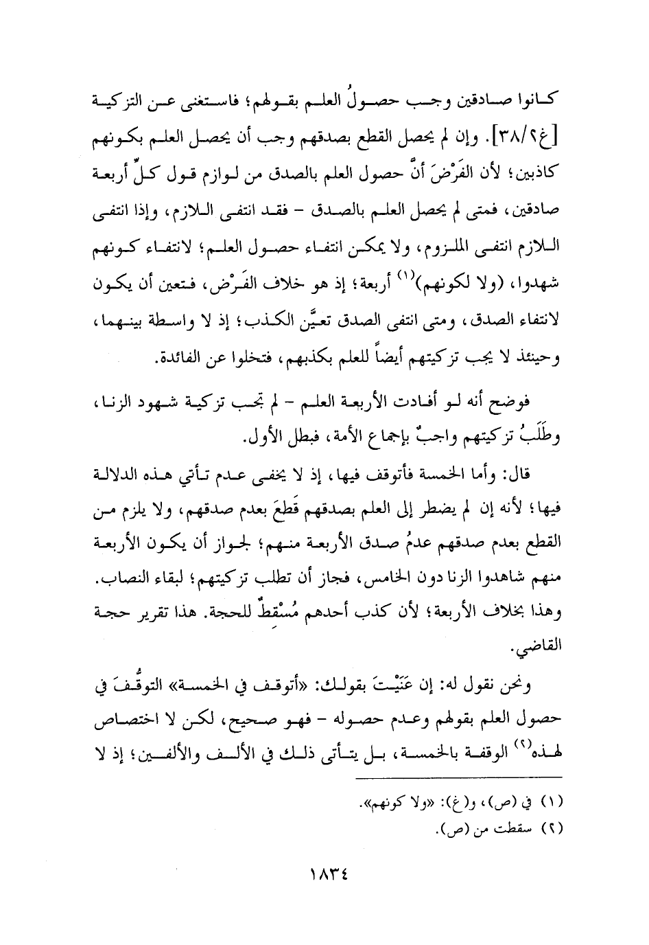 فوضح أنه لو أفادت الأربعة العلم - لم تجب تزكية شهود الزنا، وطَلَبُ تزكيتهم واجبٌ بإجماع الأمة، فبطل الأول.