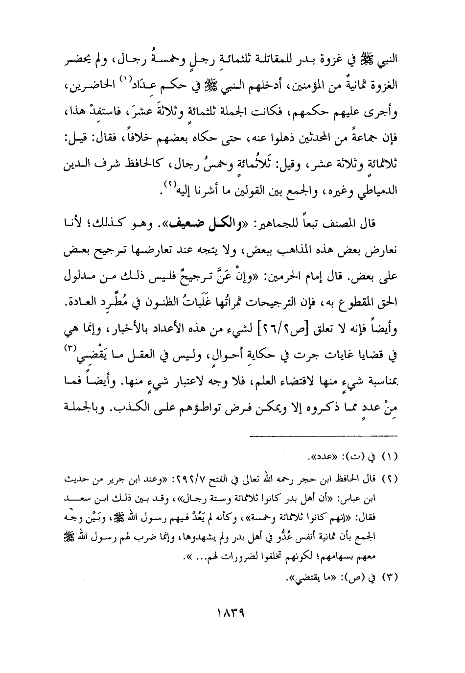 (¬٢) قال الحافظ ابن حجر رحمه الله تعالى في الفتح ٧/ ٢٩٢: "وعند ابن جرير من حديث ابن عباس: "أن أهل بدر كانوا ثلاثمائة ستة رجال"، وقد بين ذلك ابن سعد فقال: "إنهم كانوا ثلاثمائة وخمسة"، وكأنه لم يَعُدَّ فيهم رسول الله - صلى الله عليه وسلم -، وبَيَّن وجه الجمع بأن ثمانية أنفس عُدُّو في أهل بدر ولم يشهدوها، وإنما ضرب لهم رسول الله - صلى الله عليه وسلم - معهم بسهامهم؛ لكونهم تخلفوا لضرورات لهم. . .".