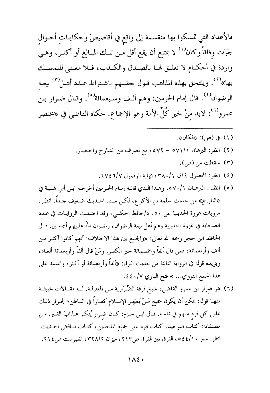 (¬٥) انظر: البرهان ١/ ٥٧٠. وهذا الذي قاله إمام الحرمين أخرجه ابن أبي شيبة في "التاريخ" من حديث سلمة بن الأكوع، لكن سند الحديث ضعيف جدًا. انظر: مرويات غزوة الحديبية ص ٥٠، د/ حافظ الحكمي، وقد اختلفت الروايات في عدد الصحابة في غزوة الحديبية وهم أهل بيعة الرضوان، رضوان الله عليهم أجمعين. قال الحافظ ابن حجر رحمه الله تعالى: "والجمع بين هذا الاختلاف: أنهم كانوا أكثر من ألف وأربعمائة، فمن قال ألفًا وخمسمائة جبر الكسر. ومَنْ قال ألفًا وأربعمائة ألغاه، ويؤيده قوله في الرواية الثالثة من حديث البراء: "ألفًا وأربعمائة أو أكثر، واعتمد على هذا الجمع النووي. . ." فتح الباري ٧/ ٤٤٠.