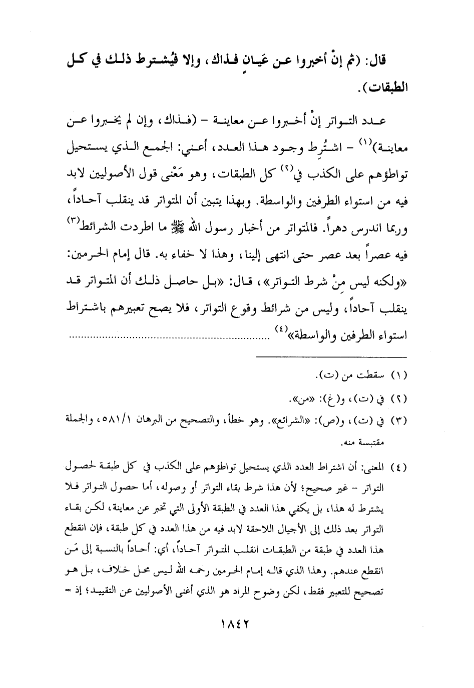 (¬٤) المعنى: أن اشتراط العدد الذي يستحيل تواطؤهم على الكذب في كل طبقة لحصول التواتر - غير صحيح؛ لأن هذا شرط بقاء التواتر أو وصوله، أما حصول التواتر فلا يشترط له هذا، بل يكفي هذا العدد في الطبقة الأولى التي تخبر عن معاينة، لكن بقاء التواتر بعد ذلك إلى الأجيال اللاحقة لا بد فيه من هذا العدد في كل طبعة، فإن انقطع هذا العدد في طبقة من الطبقات انقلب التواتر آحادًا، أي: أحادًا بالنسبة إلى مَن انقطع عندهم. وهذا الذي قاله إمام الحرمين رحمه الله ليس محل خلاف، بل هو تصحيح للتعبير فقط، لكن وضوح المراد هو الذي أغنى الأصوليين عن التقييد؛ إذ =