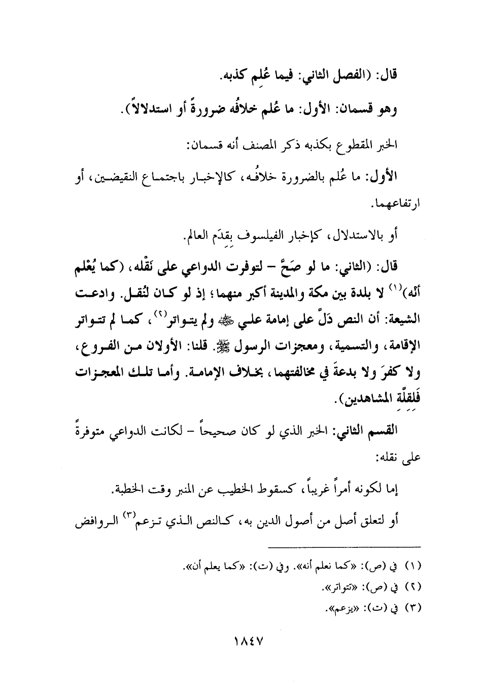 قال: (الثاني: ما لو صَحَّ - لتوفرت الدواعي على نَقْله، (كما يُعْلم أنَّه) (¬١) لا بلدة بين مكة والمدينة أكبر منهما؛ إذ لو كان لنُقل. وادعت الشيعة: أن النص دَلَّ على إمامة علي - رضي الله عنه - ولم يتواتر (¬٢)، كما لم تتواتر الإقامة، والتسمية، ومعجزات الرسول - صلى الله عليه وسلم -. قلنا: الأولان من الفروع، ولا كفرَ ولا بدعةَ في مخالفتهما، بخلاف الإمامة. وأما تلك المعجزات فَلِقِلَّةِ المشاهدين).