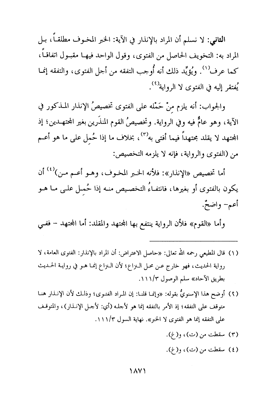 (¬٢) أوضح هذا الإسنويُّ بقوله: "وإنما قلنا: إن المراد الفتوى؛ وذلك لأن الإنذار هنا متوقف على التفقه؛ إذ الأمر بالتفقه إنما هو لأجله (أي: لأجل الإنذار)، والمتوقف على التفقه إنما هو الفتوى لا الخبر". نهاية السول ٣/ ١١١.