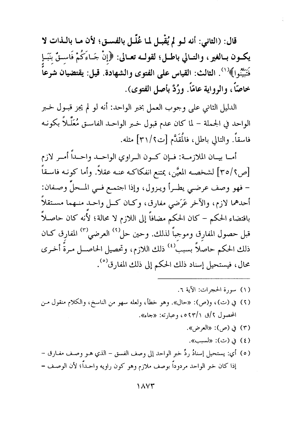 قال: (الثاني: أنه لو لم يُقْبل لما عُلِّل بالفسق؛ لأن ما بالذات لا يكون بالغير، والتالي باطل؛ لقوله تعالى: {إِنْ جَاءَكُمْ فَاسِقٌ بِنَبَإٍ فَتَبَيَّنُوا} (¬١). الثالث: القياس على الفتوى والشهادة. قيل: يقتضيان شرعًا خاصًّا، والرواية عامًّا. ورُدَّ بأصل الفتوى).