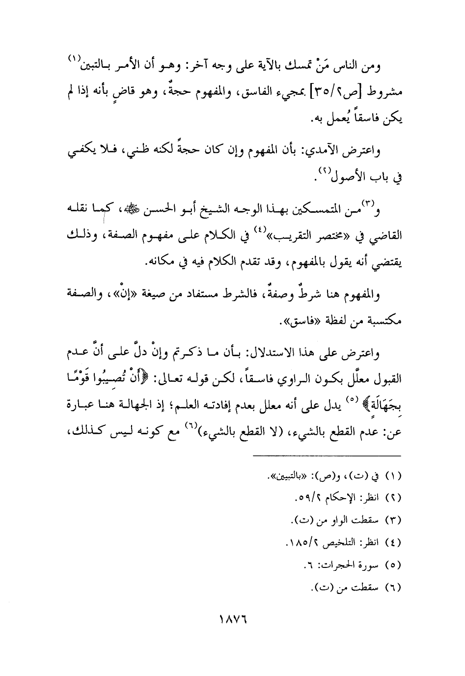 واعترض الآمدي: بأن المفهوم وإن كان حجةً لكنه ظني، فلا يكفي في باب الأصول (¬٢).