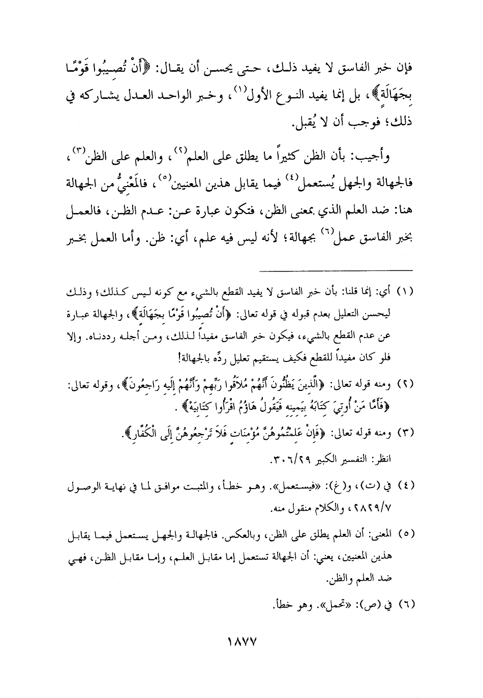 (¬١) أي: إنما قلنا: بأن خبر الفاسق لا يفيد القطع بالشيء مع كونه ليس كذلك؛ وذلك ليحسن التعليل بعدم قبوله في قوله تعالى: {أَنْ تُصِيبُوا قَوْمًا بِجَهَالَةٍ}، والجهالة عبارة عن عدم القطع بالشيء، فيكون خبر الفاسق مفيدًا لذلك، ومن أجله رددناه. وإلا فلو كان مفيدًا للقطع فكيف يستقيم تعليل ردِّه بالجهالة!