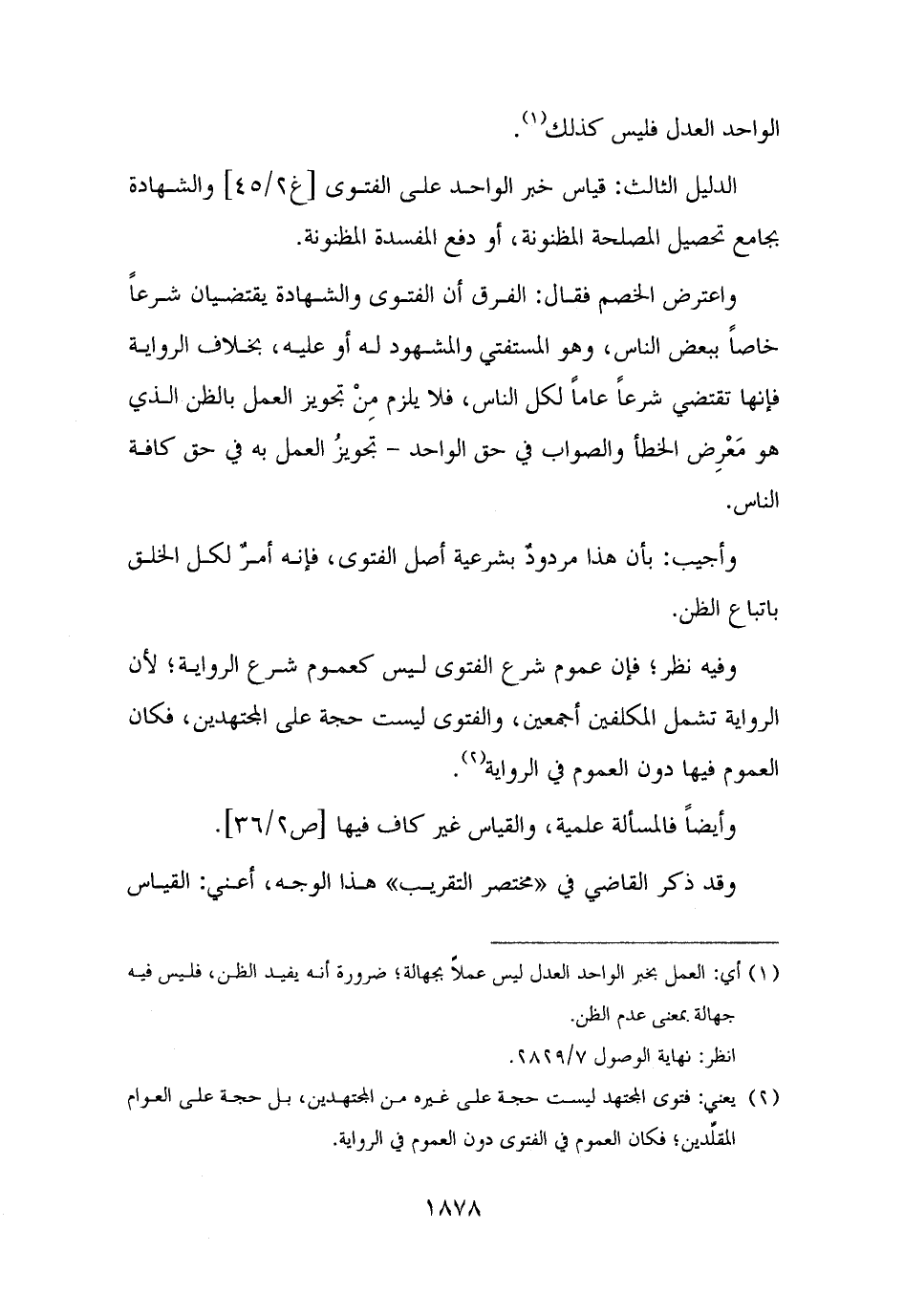 الدليل الثالث: قياس خبر الواحد على الفتوى والشهادة بجامع تحصيل المصلحة المظنونة، أو دفع المفسدة المظنونة.
