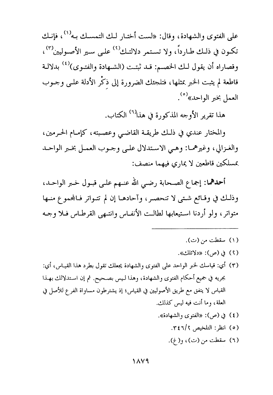 (¬٣) أي: قياسك لخبر الواحد على الفتوى والشهادة يجعلك تقول بطرد هذا القياس، أي: بجريه في جميع أحكام الفتوى والشهادة، وهذا ليس بصحيح. ثم إن استدلالك بهذا القياس لا يتفق مع طريق الأصوليين في القياس؛ إذ يشترطون مساواة الفرع للأصل في العلة، وما أنت فيه ليس كذلك.