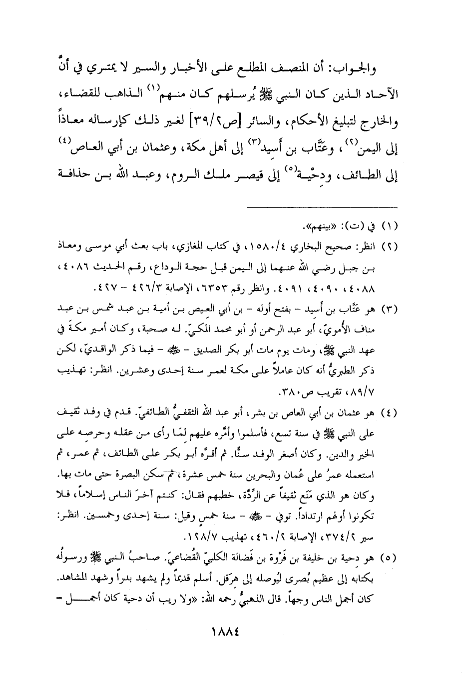 والجواب: أن المنصف المطلع على الأخبار والسير لا يمتري في أنَّ الآحاد الذين كان النبي - صلى الله عليه وسلم - يُرسلهم كان منهم (¬١) الذاهب للقضاء، والخارج لتبليغ الأحكام، والسائر لغير ذلك كإرساله معاذًا إلى اليمن (¬٢)، وعَتَّاب بن أَسِيد (¬٣) إلى أهل مكة، وعثمان بن أبي العاص (¬٤) إلى الطائف، ودِحْية (¬٥) إلى قيصر ملك الروم، وعبد الله بن حذافة