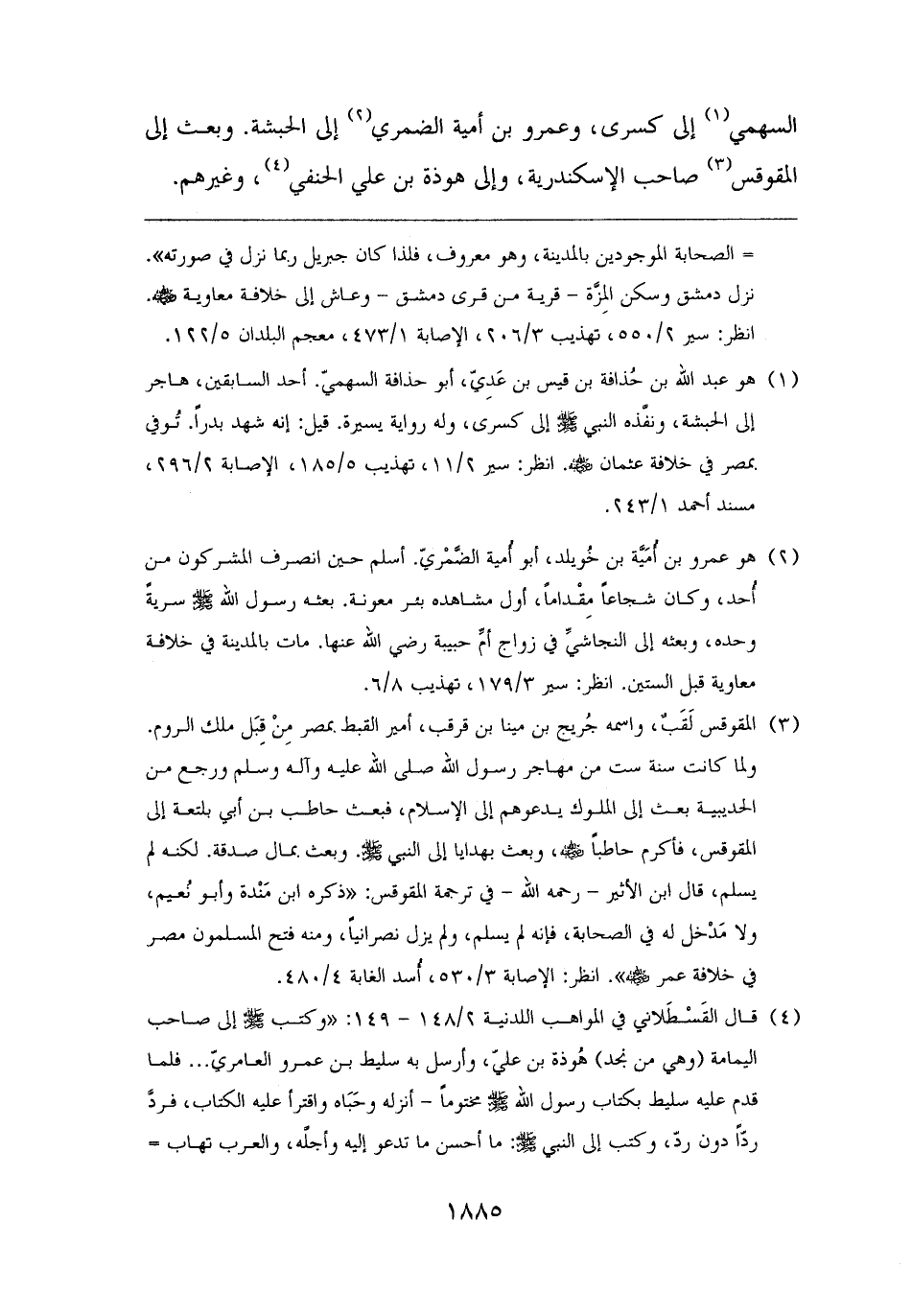 السهمي (¬١) إلى كسرى، وعمرو بن أمية الضمري (¬٢) إلى الحبشة. وبعث إلى المقوقس (¬٣) صاحب الإسكندرية، وإلى هوذة بن علي الحنفي (¬٤)، وغيرهم.
