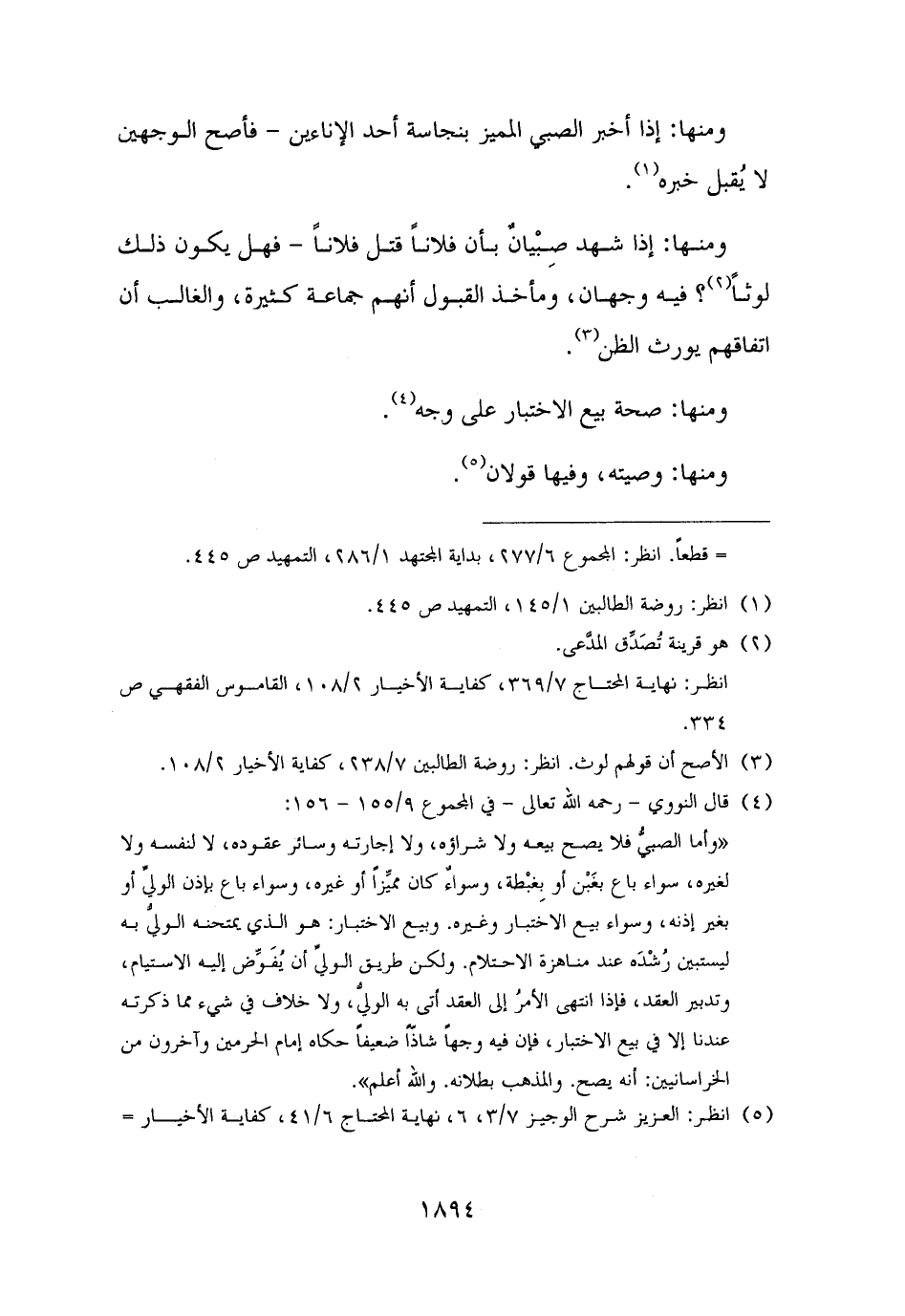 (¬٤) قال النووي - رحمه الله تعالى - في المجموع ٩/ ١٥٥ - ١٥٦: "وأما الصبيُّ فلا يصح بيعه ولا شراؤه، ولا إجارته وسائر عقوده، لا لنفسه ولا لغيره، سواء باع بغَبْن أو بِغبْطة، وسواءٌ كان مميِّزًا أو غيره، وسواء باع بإذن الوليِّ أو بغير إذنه، وسواء بيع الاختبار وغيره. وبيع الاختبار: هو الذي يمتحنه الوليُّ به ليستبين رُشْدَه عند مناهزة الاحتلام. ولكن طريق الوليِّ أن يُفَوِّض إليه الاستيام، وتدبير العقد، فإذا انتهى الأمرُ إلى العقد أتى به الوليُّ، ولا خلاف في شيء مما ذكرته عندنا إلا في بيع الاختبار، فإن فيه وجهًا شاذًا ضعيفًا حكاه إمام الحرمين وآخرون من الخراسانيين: أنه يصح. والمذهب بطلانه. والله أعلم".