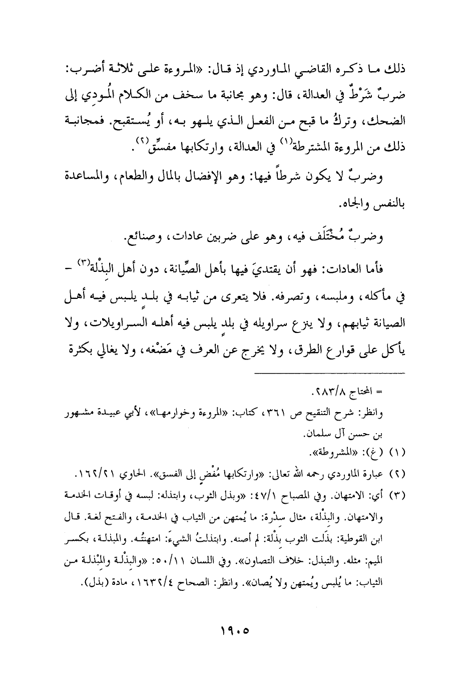 ذلك ما ذكره القاضي الماوردي إذ قال: "المروءة على ثلاثة أضرب: ضربٌ شَرْطٌ في العدالة، قال: وهو مجانبة ما سخف من الكلام المُودِي إلى الضحك، وتركُ ما قبح من الفعل الذي يلهو به، أو يُستقبح، فمجانبة ذلك من المروءة المشترطة (¬١) في العدالة، وارتكابها مفسِّق (¬٢).