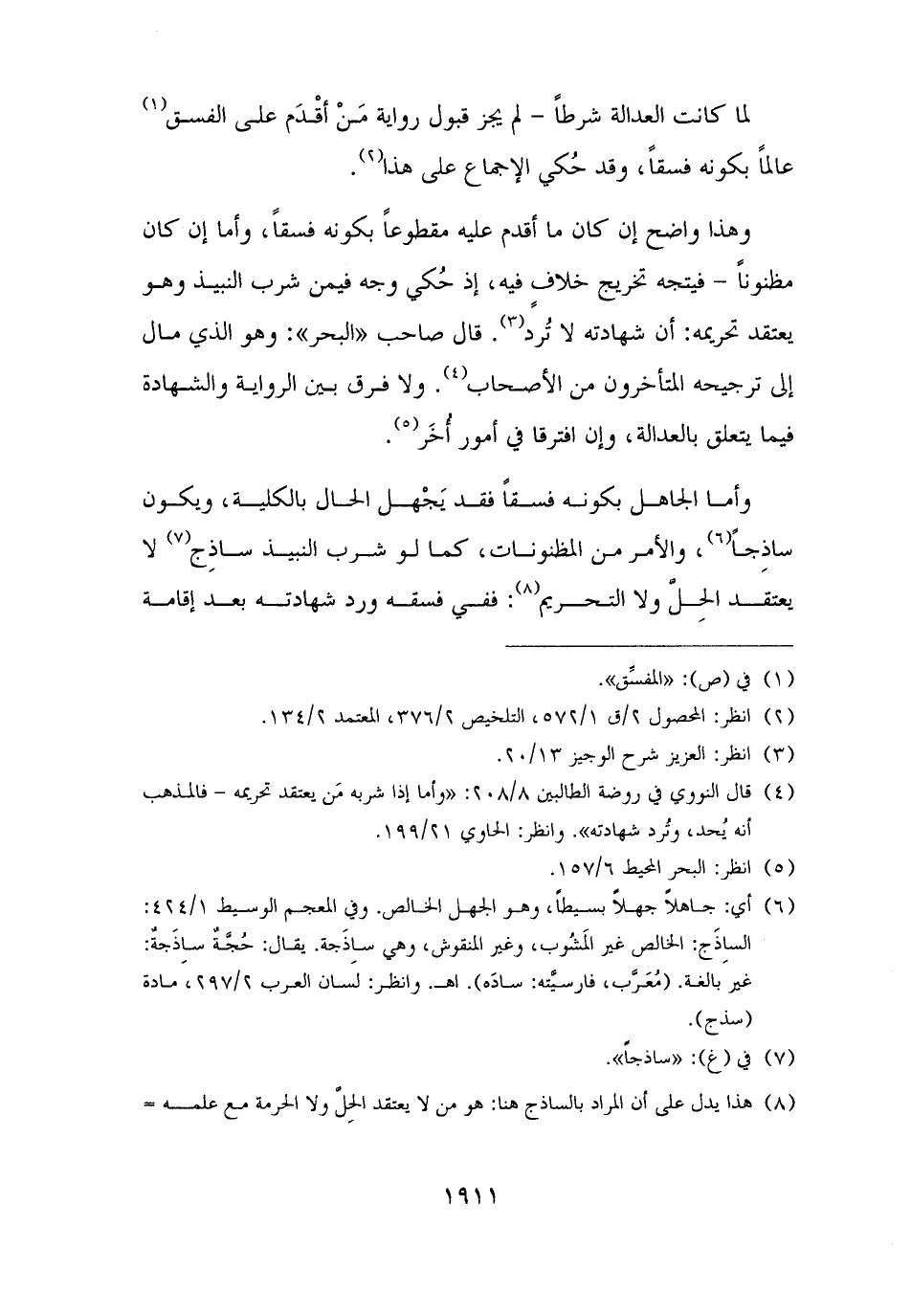 وهذا واضح إن كان ما أقدم عليه مقطوعًا بكونه فسقًا، وأما إن كان مظنونًا - فيتجه تخريج خلافٍ فيه، إذ حُكي وجه فيمن شرب النبيذ وهو يعتقد تحريمه: أن شهادته لا تُرد (¬٣). قال صاحب "البحر": وهو الذي مال إلى ترجيحه المتأخرون من الأصحاب (¬٤). ولا فرق بين الرواية والشهادة فيما يتعلق بالعدالة، وإن افترقا في أمور أُخَر (¬٥).