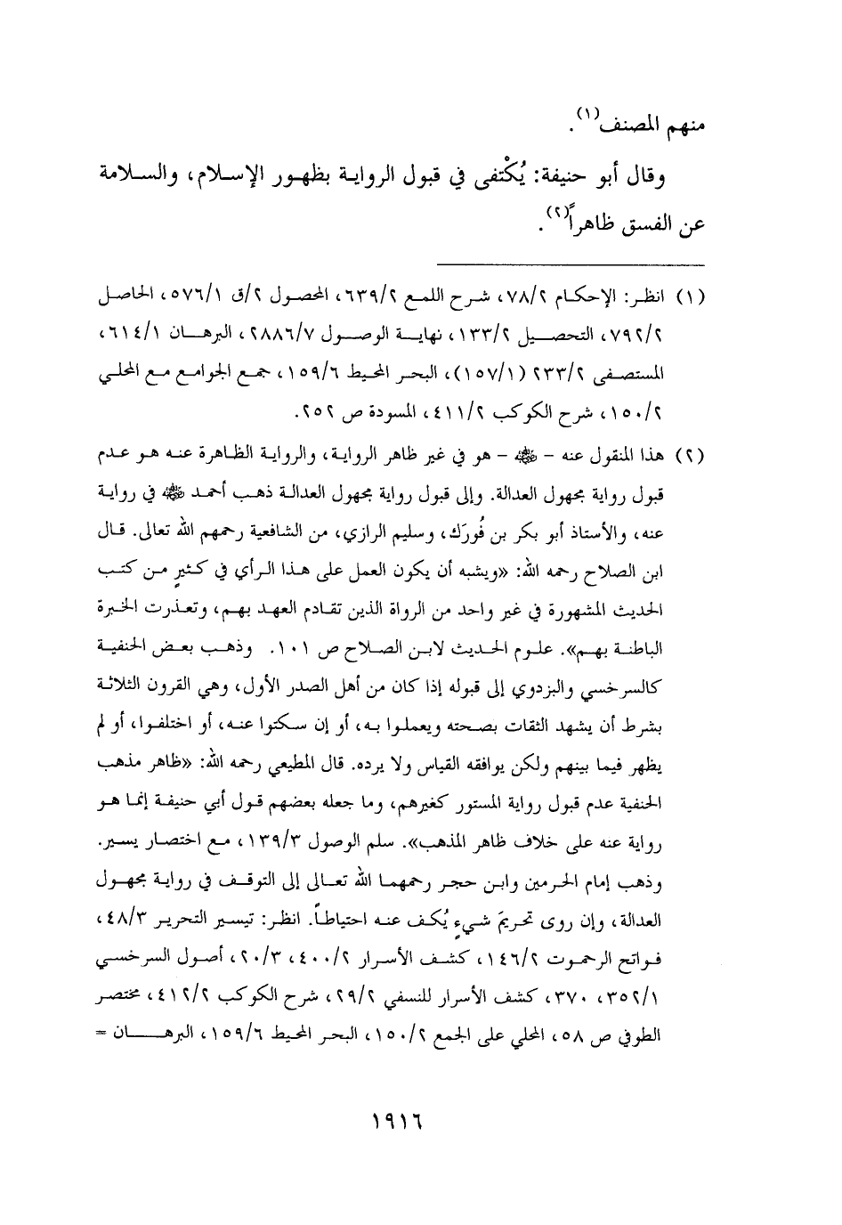 (¬٢) هذا المنقول عنه - رضي الله عنه - هو في غير ظاهر الرواية، والرواية الظاهرة عنه هو عدم قبول رواية مجهول العدالة. وإلى قبول رواية مجهول العدالة ذهب أحمد - رضي الله عنه - في رواية عنه، والأستاذ أبو بكر بن فُورَك، وسليم الرازي، من الشافعية رحمهم الله تعالى. قال ابن الصلاح رحمه الله: "ويشبه أن يكون العمل على هذا الرأي في كثير من كتب الحديث المشهورة في غير واحد من الرواة الذين تقادم العهد بهم، وتعذرت الخبرة الباطنة بهم". علوم الحديث لابن الصلاح ص ١٠١. وذهب بعض الحنفية كالسرخسي والبزدوي إلى قبوله إذا كان من أهل الصدر الأول، وهي القرون الثلاثة بشرط أن يشهد الثقات بصحته ويعملوا به، أو إن سكتوا عنه، أو اختلفوا، أو لم يظهر فيما بينهم ولكن يوافقه القياس ولا يرده. قال المطيعي رحمه الله: "ظاهر مذهب الحنفية عدم قبول رواية المستور كغيرهم، وما جعله بعضهم قول أبي حنيفة إنما هو رواية عنه على خلاف ظاهر المذهب". سلم الوصول ٣/ ١٣٩، مع اختصار يسير. وذهب إمام الحرمين وابن حجر رحمهما الله تعالى إلى التوقف في رواية مجهول العدالة، وإن روى تحريمَ شيءٍ يُكف عنه احتياطًا. انظر: تيسير التحرير ٣/ ٤٨، فواتح الرحموت ٢/ ١٤٦، كشف الأسرار ٢/ ٤٠٠، ٣/ ٢٠، أصول السرخسي ١/ ٣٥٢، ٣٧٠، كشف الأسرار للنسفي ٢/ ٢٩، شرح الكوكب ٢/ ٤١٢، مختصر الطوفي ص ٥٨، المحلي على الجمع ٢/ ١٥٠، البحر المحيط ٦/ ١٥٩، البرهان =