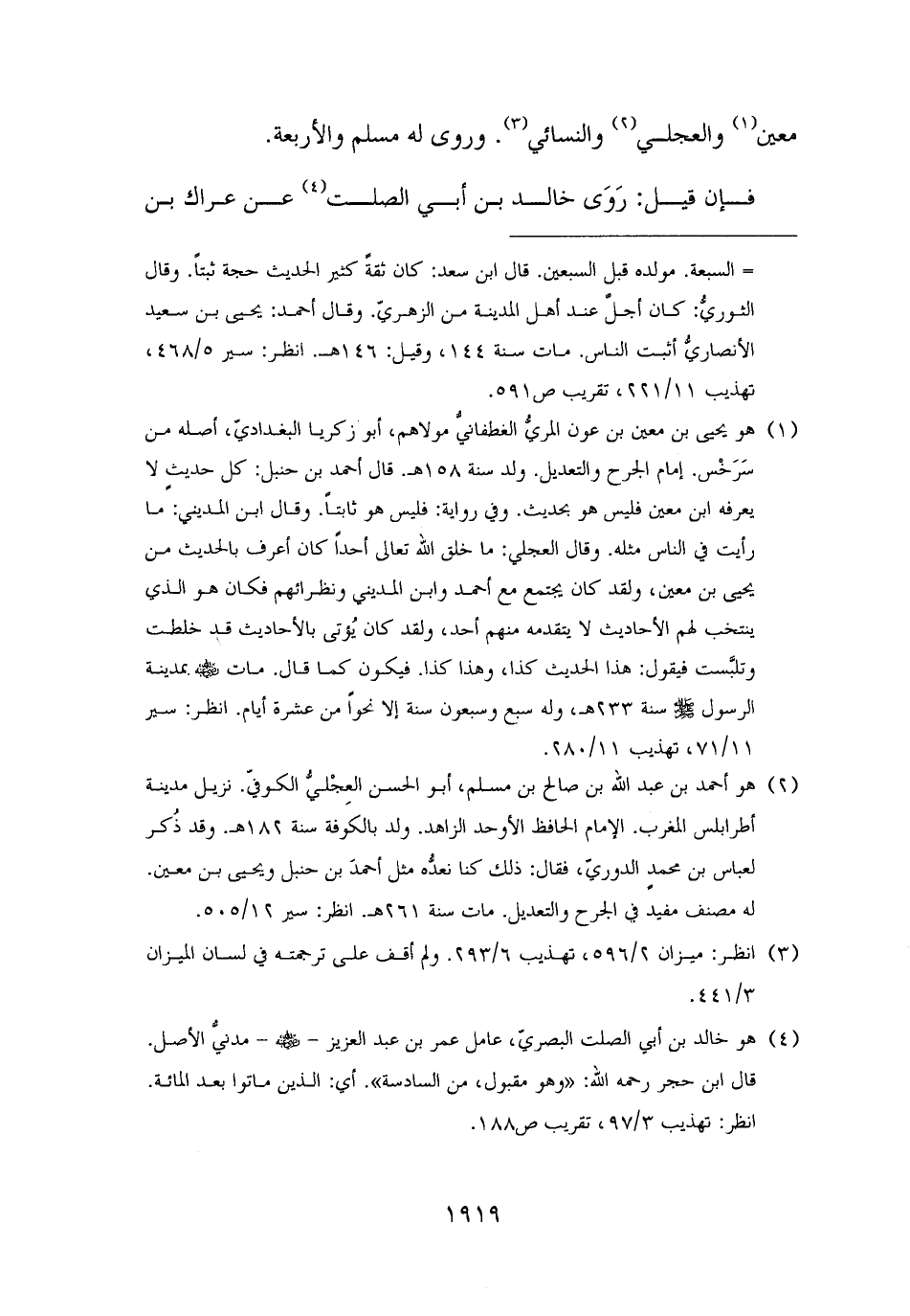 (¬٢) هو أحمد بن عبد الله بن صالح بن مسلم، أبو الحسن العِجْليُّ الكوفيّ. نزيل مدينة أطرابلس المغرب. الإمام الحافظ الأوحد الزاهد. ولد بالكوفة سنة ١٨٢ هـ. وقد ذُكر لعباس بن محمد الدوريّ، فقال: ذلك كنا نعدُّه مثل أحمدَ بن حنبل ويحيى بن معين. له مصنف مفيد في الجرح والتعديل. مات سنة ٢٦١ هـ. انظر: سير ١٢/ ٥٠٥.