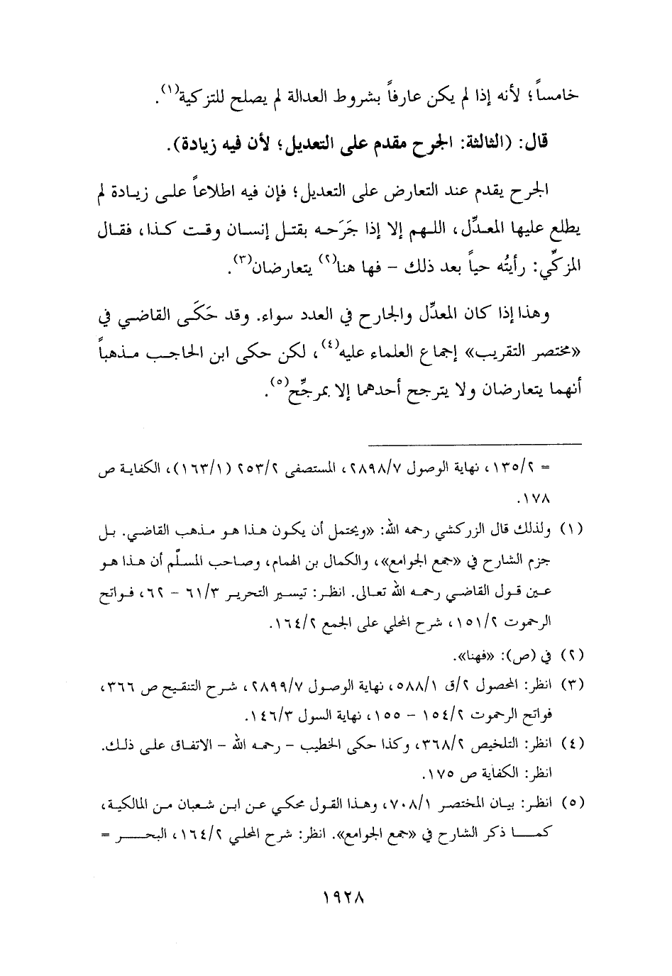 وهذا إذا كان المعدِّل والجارح في العدد سواء. وقد حَكَى القاضي في "مختصر التقريب" إجماع العلماء عليه (¬٤)، لكن حكى ابن الحاجب مذهبًا أنهما يتعارضان ولا يترجح أحدهما إلا بمرجِّح (¬٥).