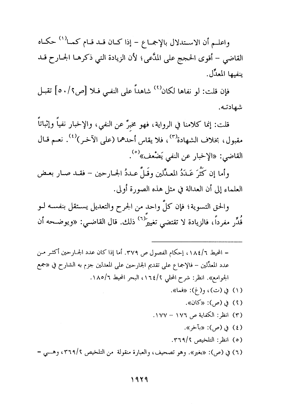 واعلم أن الاستدلال بالإجماع - إذا كان قد قام كما (¬١) حكاه القاضي - أقوى الحجج على المدَّعى؛ لأن الزيادة التي ذكرها الجارح قد ينفيها المعدِّل.