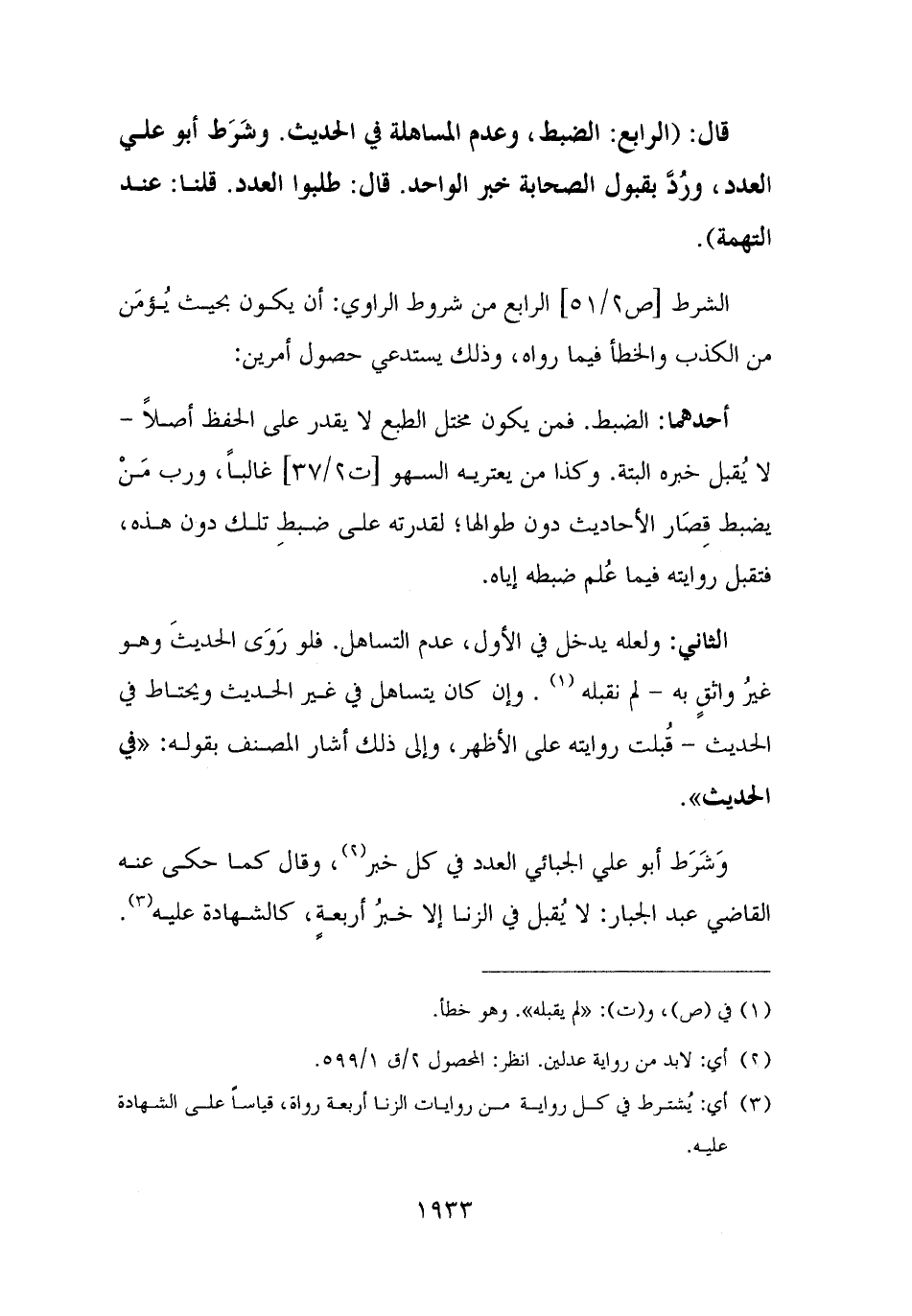 قال: (الرابع: الضبط، وعدم المساهلة في الحديث. وشَرَط أبو علي العدد، ورُدَّ بقبول الصحابة خبر الواحد. قال: طلبوا العدد. قلنا: عند التهمة).