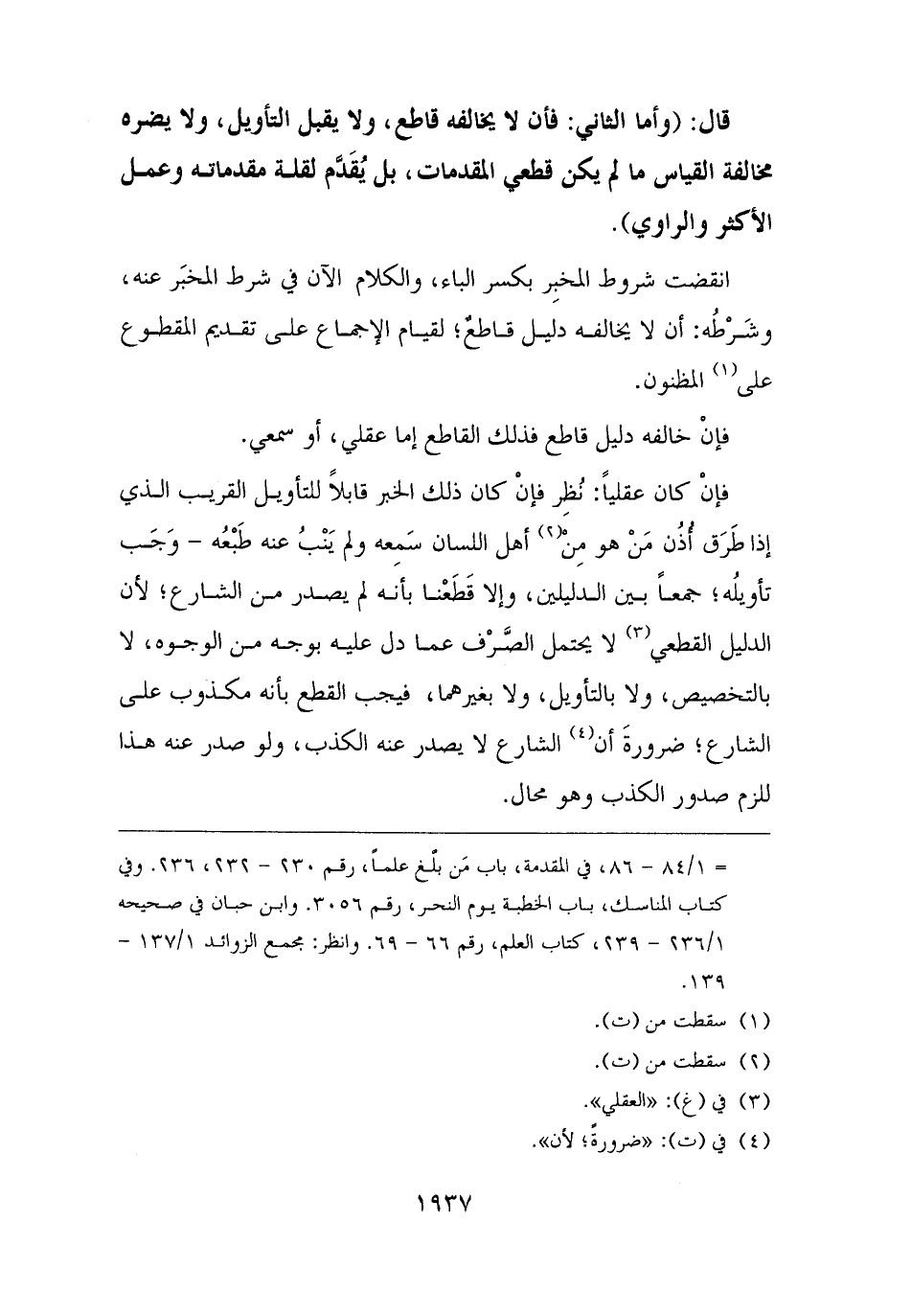 انقضت شروط المخبِر بكسر الباء، والكلام الآن في شرط المخبَر عنه، وشَرْطُه: أن لا يخالفه دليل قاطعٌ؛ لقيام الإجماع على تقديم المقطوع على (¬١) المظنون.