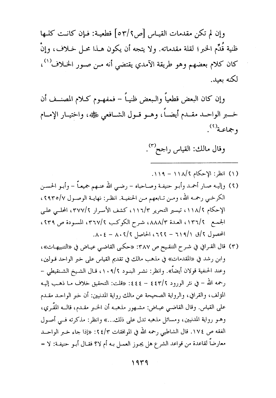 (¬٣) قال القرافي في شرح التنقيح ص ٣٨٧: "حكى القاضي عياض في "التنبيهات"، وابن رشد في "المقدمات" في مذهب مالك في تقديم القياس على خبر الواحد قولين، وعند الحنفية قولان أيضًا". وانظر: نشر البنود ٢/ ١٠٩، قال الشيخ الشنقيطي - رحمه الله - في نثر الورود ٢/ ٤٤٣ - ٤٤٤: "قلت: التحقيق خلاف ما ذهب إليه المؤلف، والقرافي، والرواية الصحيحة عن مالك رواية المدنيين: أن خبر الواحد مقدم على القياس. وقال القاضي عياض: مشهور مذهبه أن الخبر مقدم، قاله المقَّري، وهو رواية المدنيين، ومسائل مذهبه تدل على ذلك. . ." وانظر: مذكرته فى أصول الفقه ص ١٧٤. قال الشاطبي رحمه الله في الموافقات ٣/ ٢٤: "إذا جاء خبر الواحد معارضًا لقاعدة من قواعد الشرع هل يجوز العمل به أم لا؟ فقال أبو حنيفة: لا =