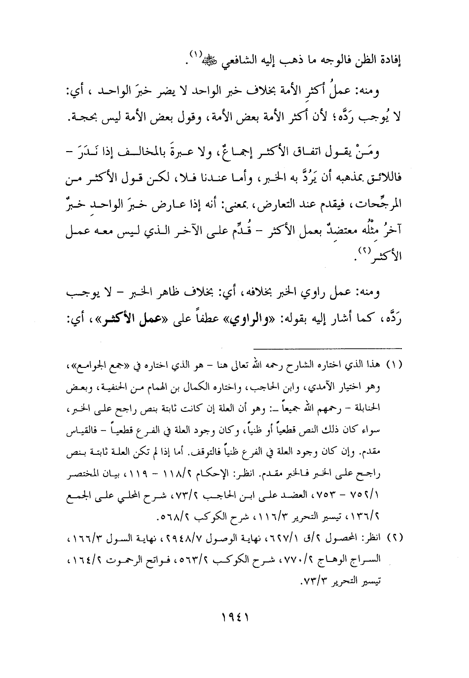 ومَنْ يقول اتفاق الأكثر إجماعٌ، ولا عبرةَ بالمخالف إذا نَدَرَ - فاللائق بمذهبه أن يَرُدَّ به الخبر، وأما عندنا فلا، لكن قول الأكثر من المرجِّحات، فيقدم عند التعارض، بمعنى: أنه إذا عارض خبرَ الواحدِ خبرٌ آخرُ مِثْلُه معتضِدٌ بعمل الأكثر - قُدِّم على الآخر الذي ليس معه عمل الأكثر (¬٢).