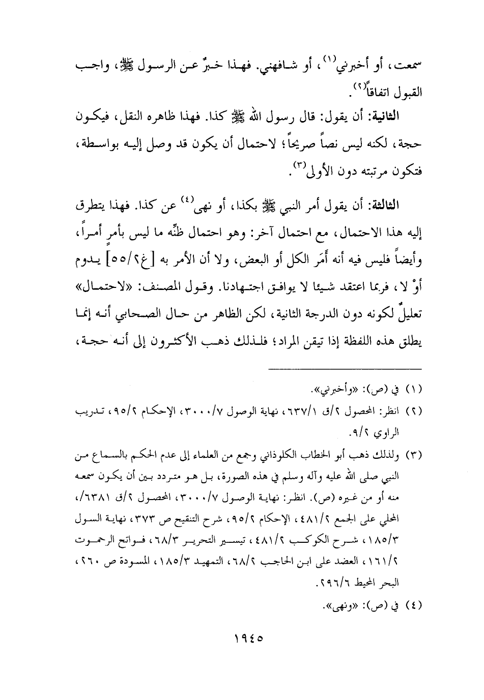 (¬٣) ولذلك ذهب أبو الخطاب الكلوذاني وجمع من العلماء إلى عدم الحكم بالسماع من النبي صلى الله عليه وآله وسلم في هذه الصورة، بل هو متردد بين أن يكون سمعه منه أو من غيره (ص). انظر: نهاية الوصول ٧/ ٣٠٠٠، المحصول ٢/ ق ٦٣٨١ /، المحلي على الجمع ٢/ ٤٨١، الإحكام ٢/ ٩٥، شرح التنقيح ص ٣٧٣، نهاية السول ٣/ ١٨٥، شرح الكوكب ٢/ ٤٨١، تيسير التحرير ٣/ ٦٨، فواتح الرحموت ٢/ ١٦١، العضد على ابن الحاجب ٢/ ٦٨، التمهيد ٣/ ١٨٥، المسودة ص ٢٦٠، البحر المحيط ٦/ ٢٩٦.